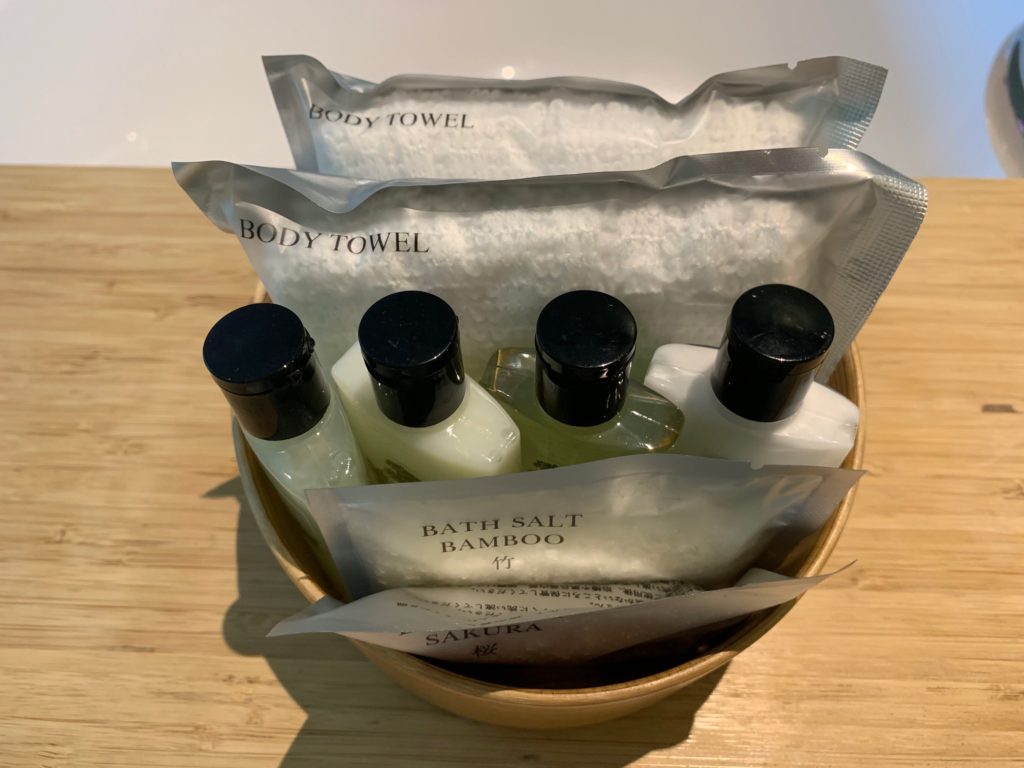 浴槽には木の板がかけられており、Agrariaのアメニティやバスソルト、ボディタオルが入った木のケースが置かれています