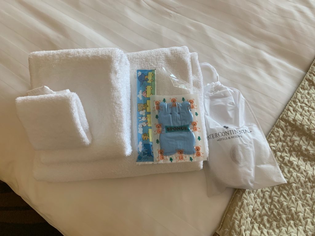 ベッドの上には子供用のアメニティ(タオル一式、子供用歯ブラシ、スポンジ、子供用スリッパ)を置いて下さっていました