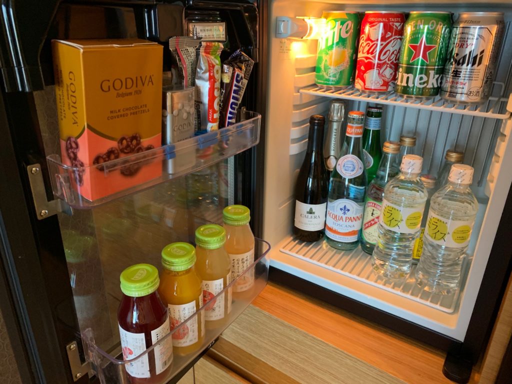 冷蔵庫の中身はこんな感じです。ちなみに「ミライズ」というミネラルウォーターは元々ネスプレッソの横に置かれていた無料のミネラルウォーターです
