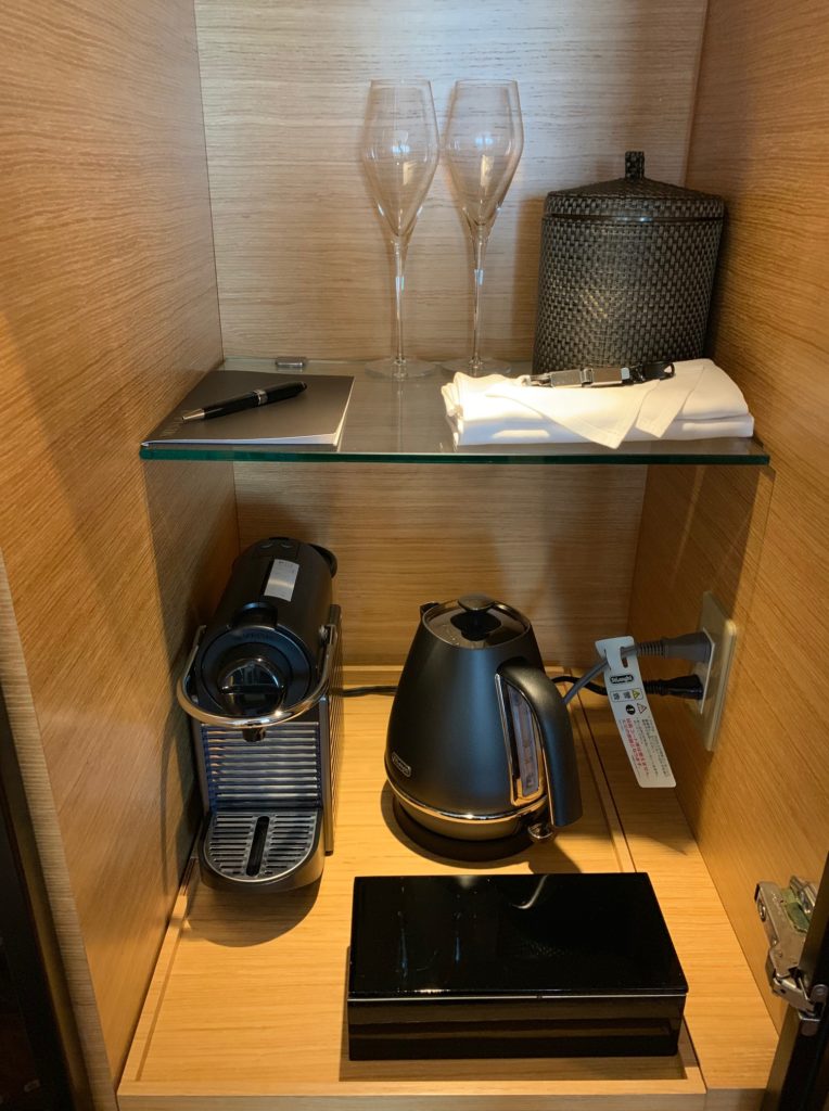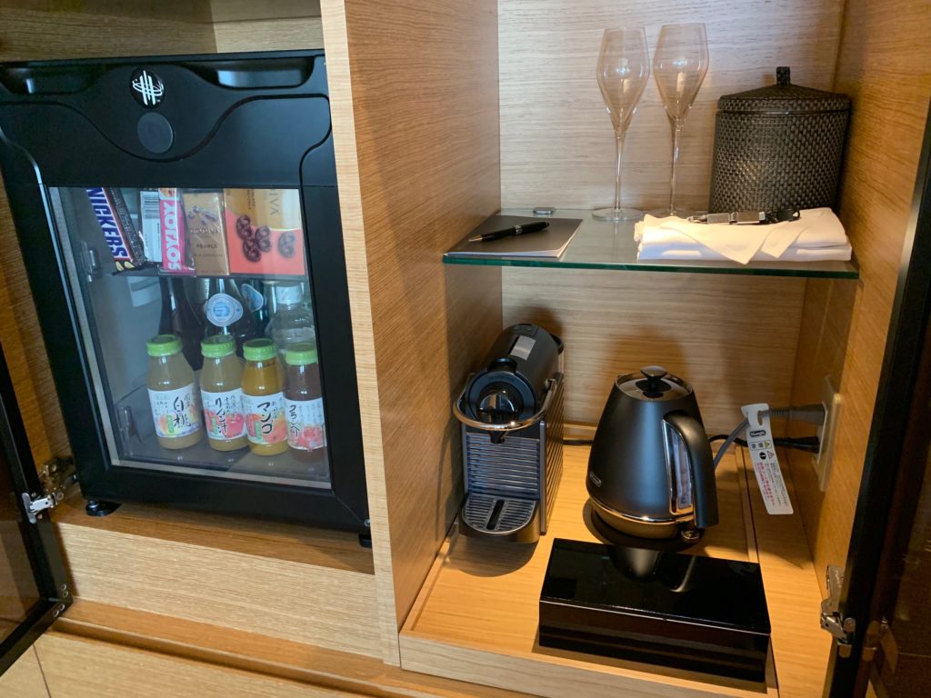 壁の黒いキャビネットの扉を開けると冷蔵庫とネスプレッソ、電気ケトルが入っています