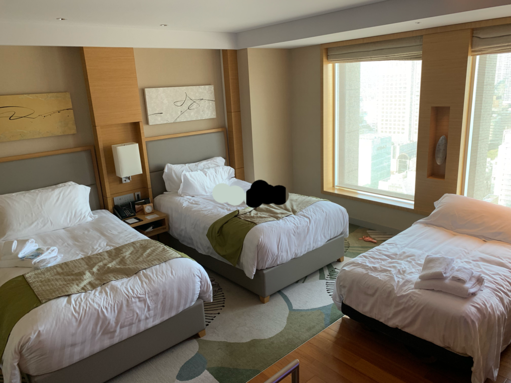 インターコンチネンタルホテル大阪は12歳以下の子供はベッド1台につき1名は添い寝OKです。ただし、常設のベッド1台につき添い寝の子供は1名までとなります。最初はキングベッド1台の部屋の提案も頂いておりましたが、そうなると消防法の規定により子供が2名とも添い寝することは不可となります。