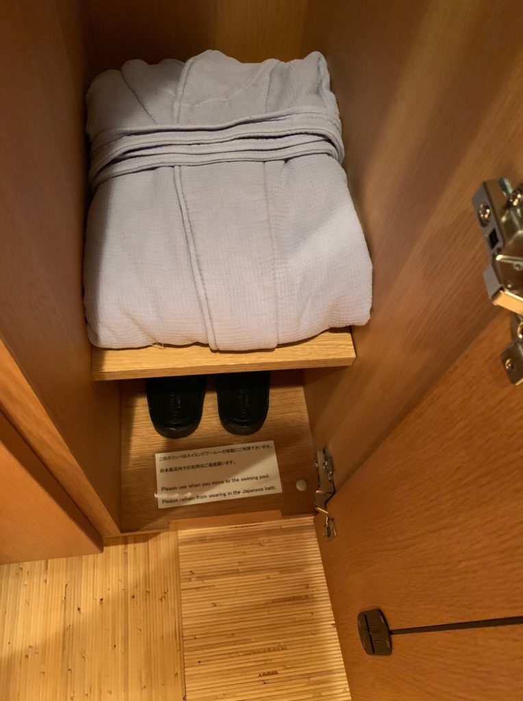 ロッカーの中にはバスローブとスリッパが入っています。プールに行くにはこのバスローブを羽織って、スリッパをはいて行くことになります。
