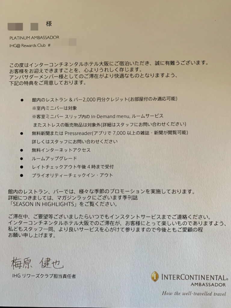 インターコンチネンタルホテル大阪におけるインターコンチネンタルアンバサダー会員特典は以下の通りとなっています。