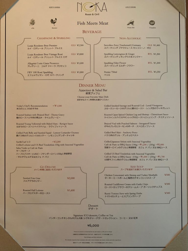 インターコンチネンタル大阪20階レストランNOKA Roast & Grill (ノカ ロースト&グリル)のメニューをご紹介します。オープンキッチンで焼き上げるメインのロースト・グリル料理に加え、前菜・デザートがビュッフェ形式で食べ放題で、お得なプランを使えば高級ホテルとは思えないお値段でディナーを頂くことができます。