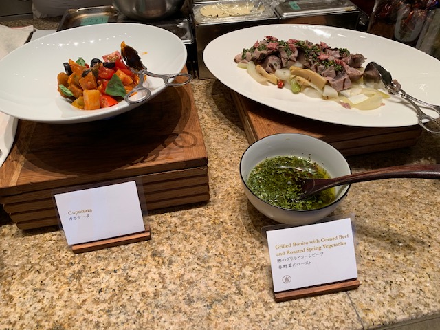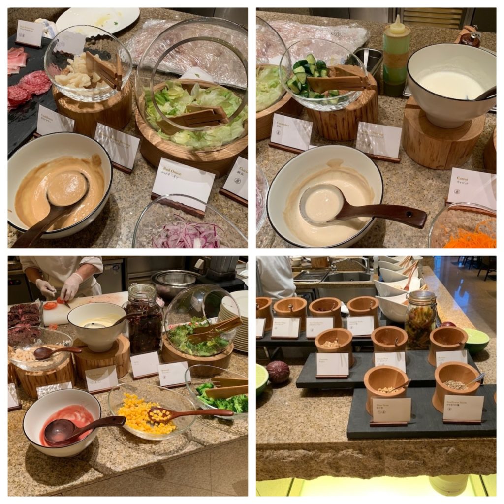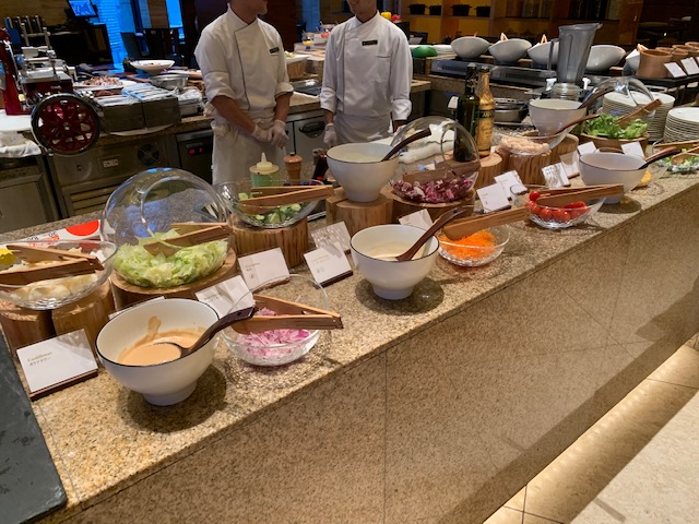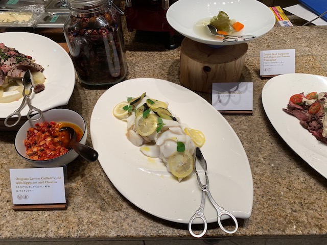 真ん中のカウンターに前菜ビュッフェがずらりと並んでいます。想像以上に種類が多かったです。