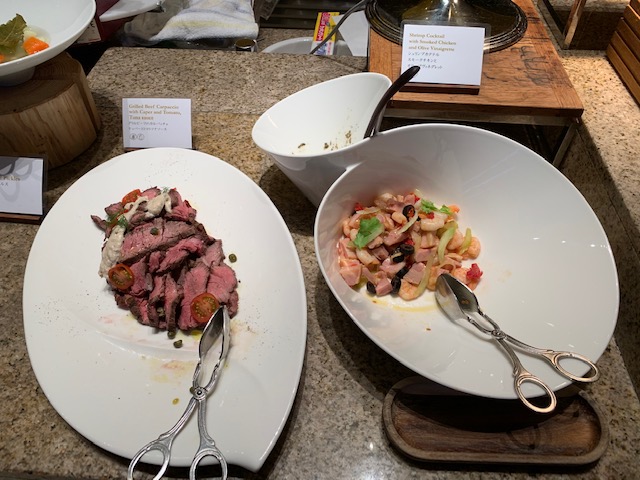 グリルビーフのカルパッチョ ケッパーとトマトツナソース、シュリンプカクテル スモークチキンとオリーブヴィネグレット