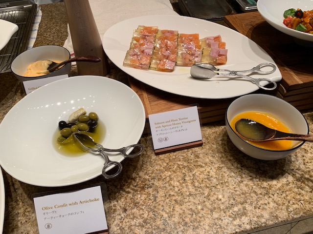 サーモンとハムのテリーヌ アプリコットハニーヴィネグレット、オリーブとアーティーチョークのコンフィ