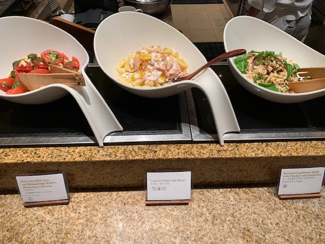 カプレーゼとペスト、パスタサラダ (ハムと海老、クリスピーエシャロット、マンゴーヨーグルト)、ローストカリフラワーのサラダ チキンとアンチョビ