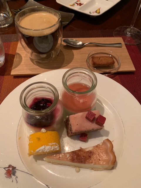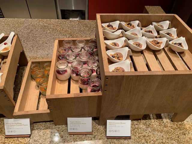 抹茶プリンと桜風味のキャラメルソース、ヨーグルトムースとストロベリーソース、ミルクチョコレートムースとナッツ