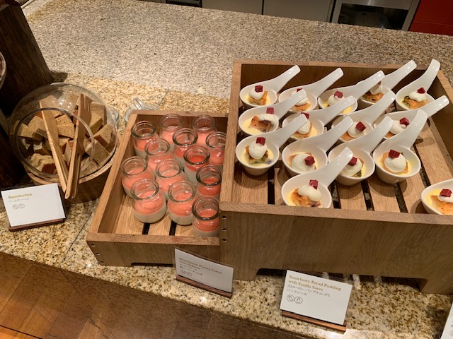 バームクーヘン、ストロベリーと桜のパンナコッタ、ストロベリーパンプディングとバニラソース