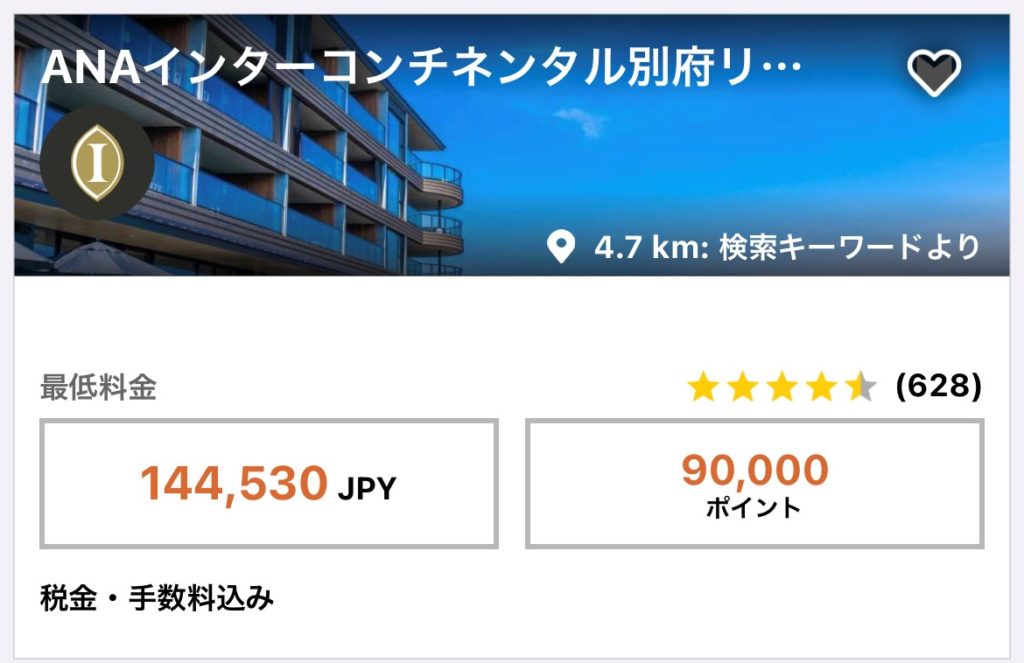 人気のインターコンチネンタル別府のケースもチェックしてみましょう。最近は繁忙期はポイント宿泊は90,000ポイント/泊となっています。