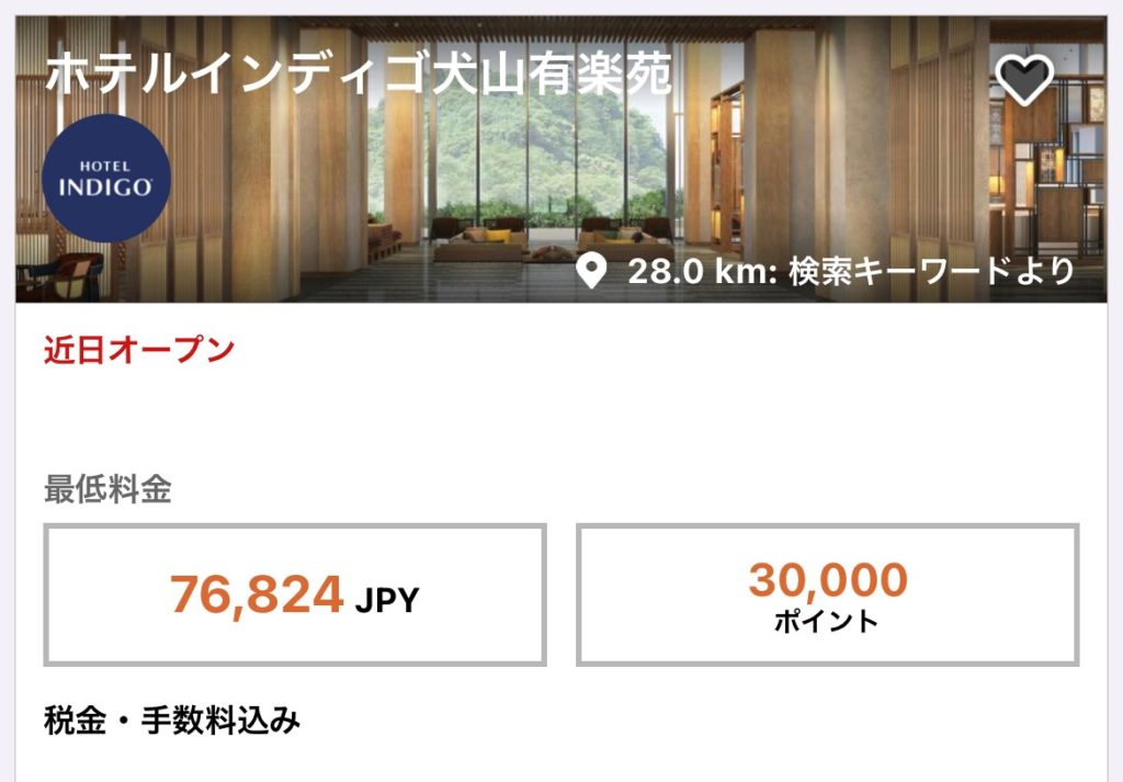 2022年3月開業予定と言われているホテルインディゴ犬山有楽苑ですがポイント宿泊が30,000ポイント/泊と比較的お得になっています