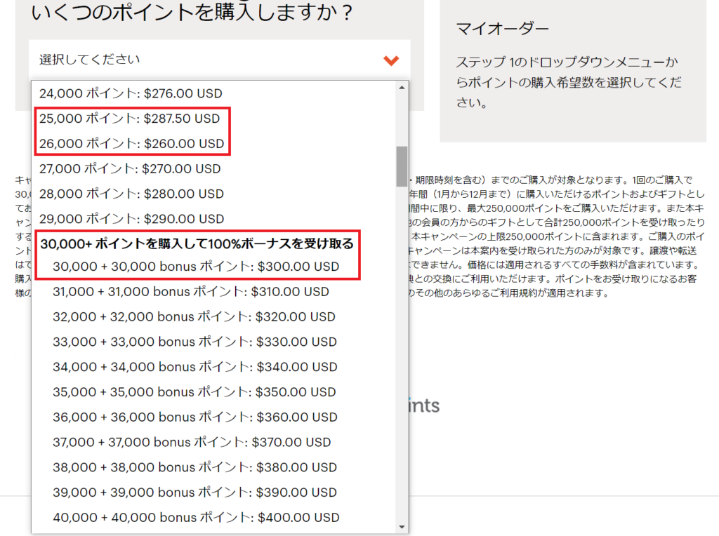 1年間(1月から12月まで)に購入可能なポイントは最大250,000ポイントであることにご注意ください。