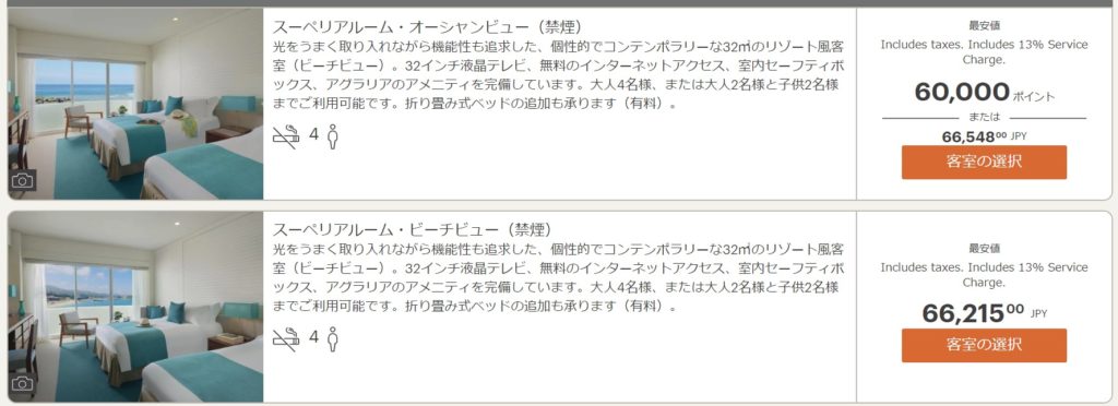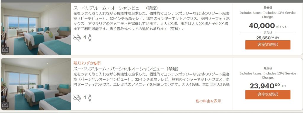 有償では23940円で、ポイント無料宿泊特典では40000ポイント必要となります。23940円/40000ポイントですので1ポイントあたり0.60円となりポイントを使った無料宿泊は少しもったいないということになります。