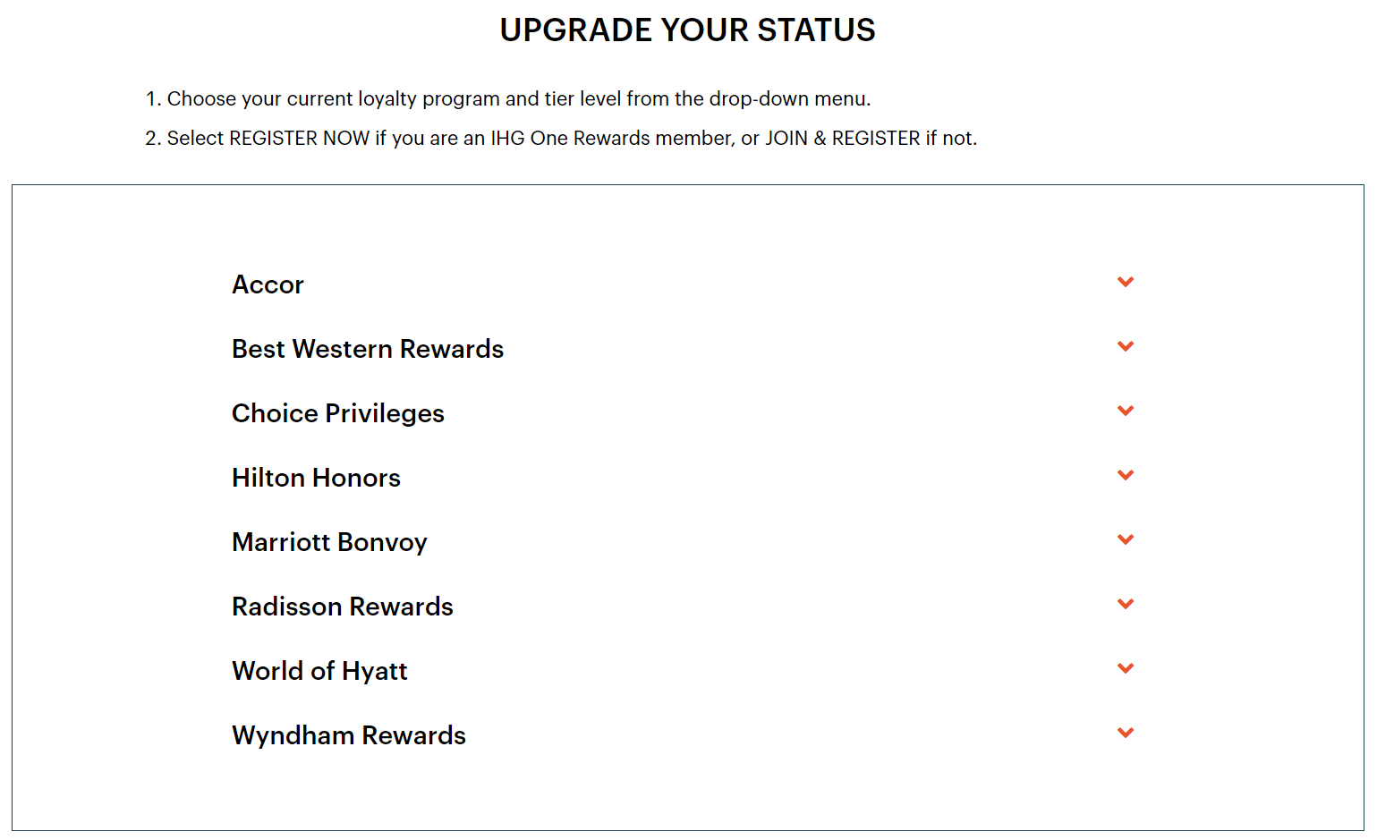 Registration for this Promotion may require the input of information relating to a member’s affiliation with other hotel loyalty programs. IHG reserves the right to verify any representations made as to participation and status in such programs.