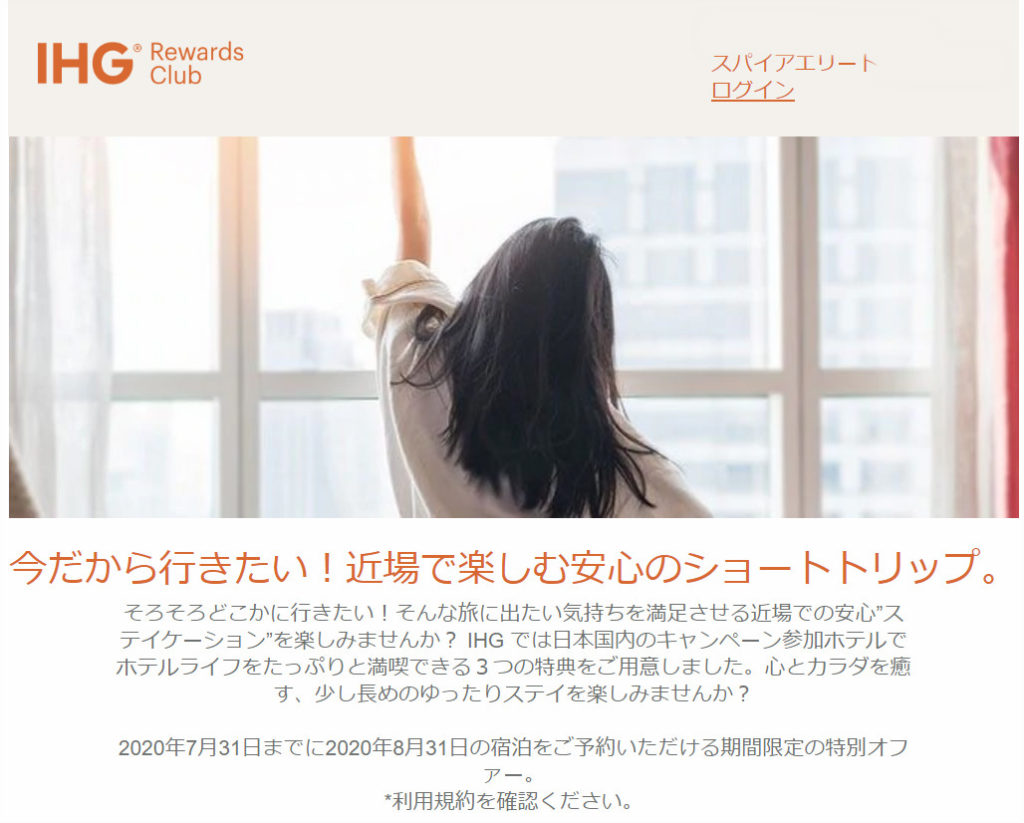 新型コロナウイルス感染拡大の影響で日本国内であっても遠方への旅行が制限される中、IHGが2020年6月9日より近場へのショートトリップのキャンペーン(今だから行きたい!近場で楽しむ安心のショートトリップ」キャンペーン)を開始しました!