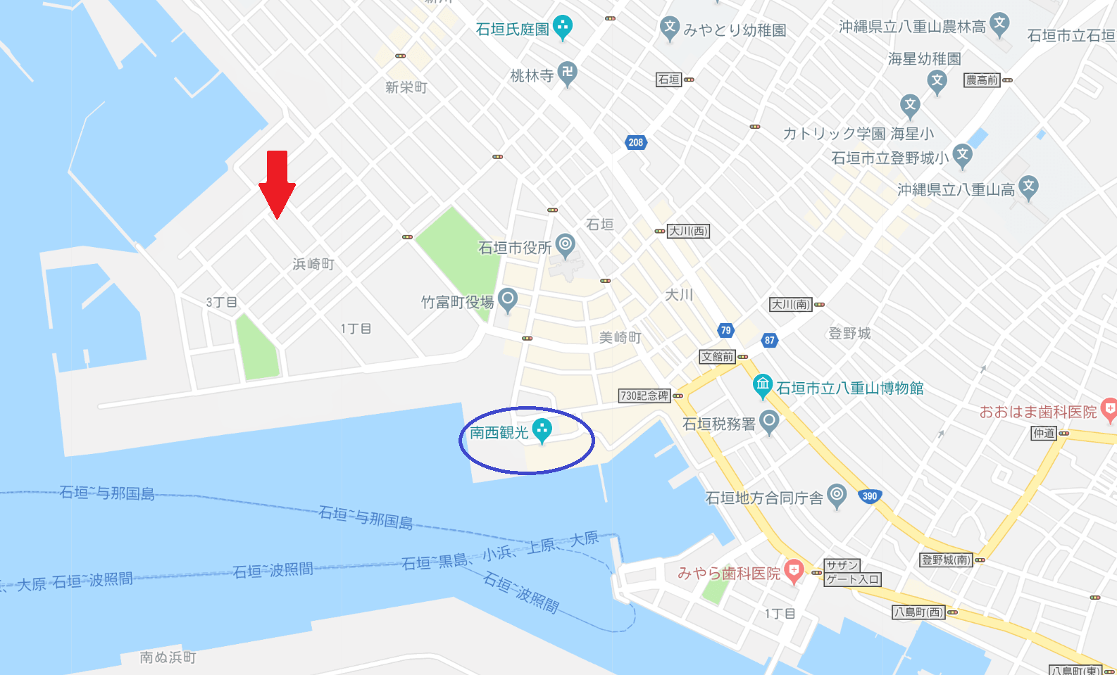 以前は離島ターミナルから程近い美崎町にあったのですが現在は少し遠くなってしまいました。下の地図の青丸が離島ターミナル、赤矢印がやまもとです。