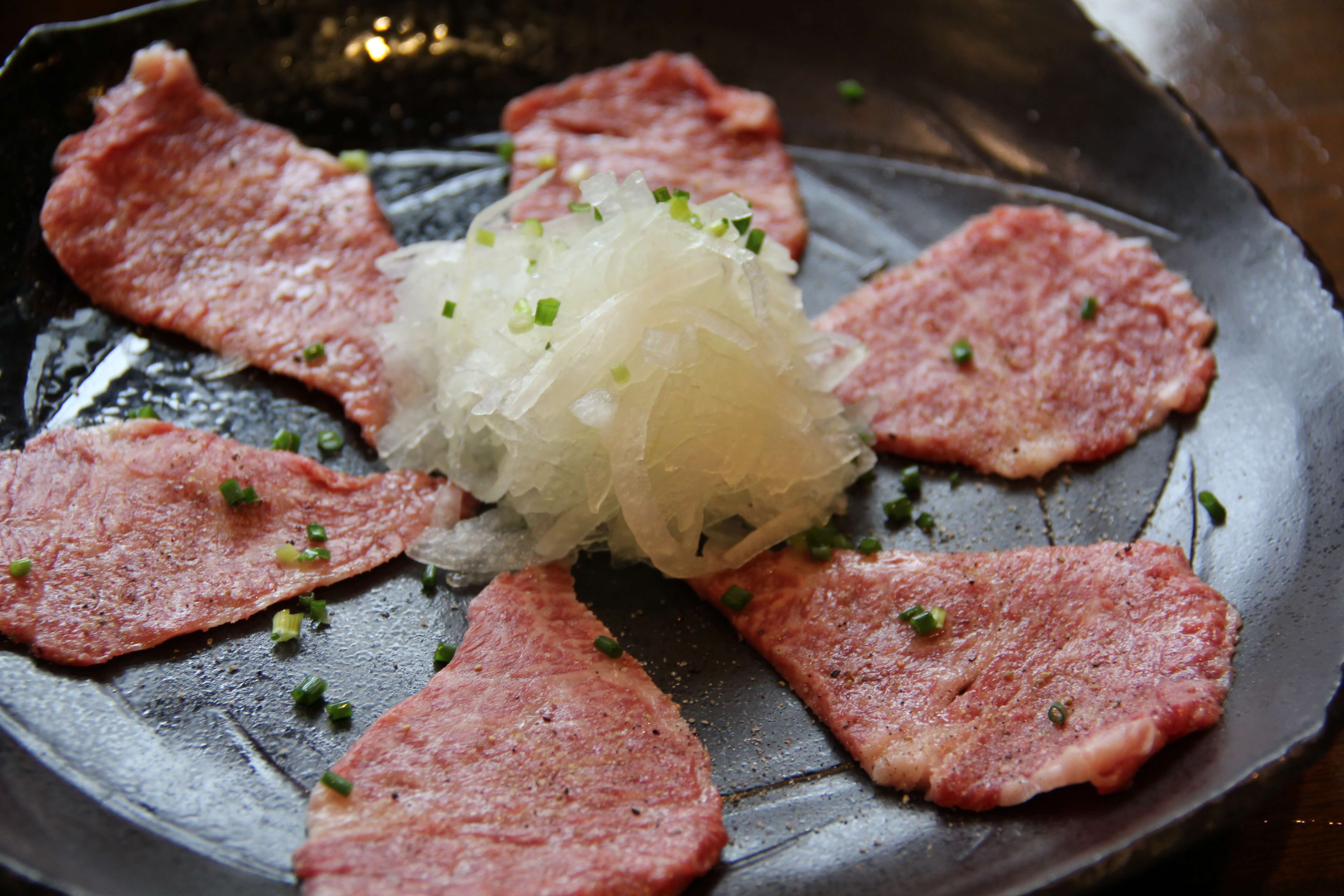 さっと両面を炙り、ほんのり薄紅色に変われば食べごろです!オニオンスライスを巻きポン酢につけて頂きます。甘味がある脂がポン酢やオニオンスライスでより引き立つように感じられ最高の食感です。