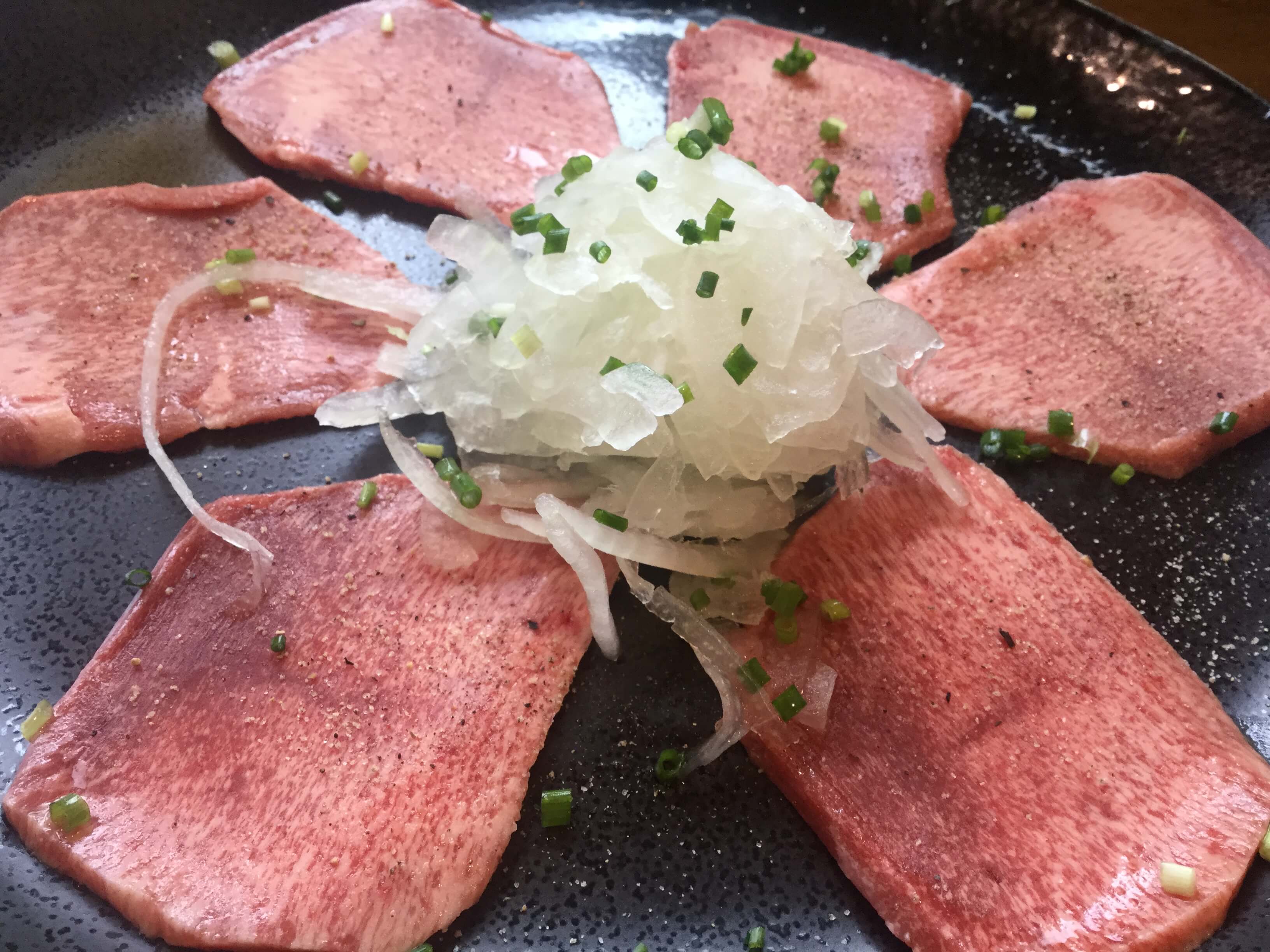 お皿にはオニオンスライスを囲むようにしてサシが美しい石垣牛の上ロースが6枚並んでいます。