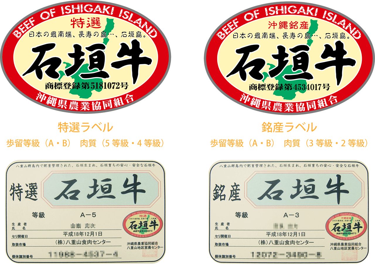 「石垣牛」とは石垣市を含む八重山郡内で生後20か月以上肥育された純粋の黒毛和種の去勢牛または雌牛です。「特選」、「銘産」のランクに選ばれた石垣牛にはJAおきなわの発行する「石垣牛」ラベルが貼られています。