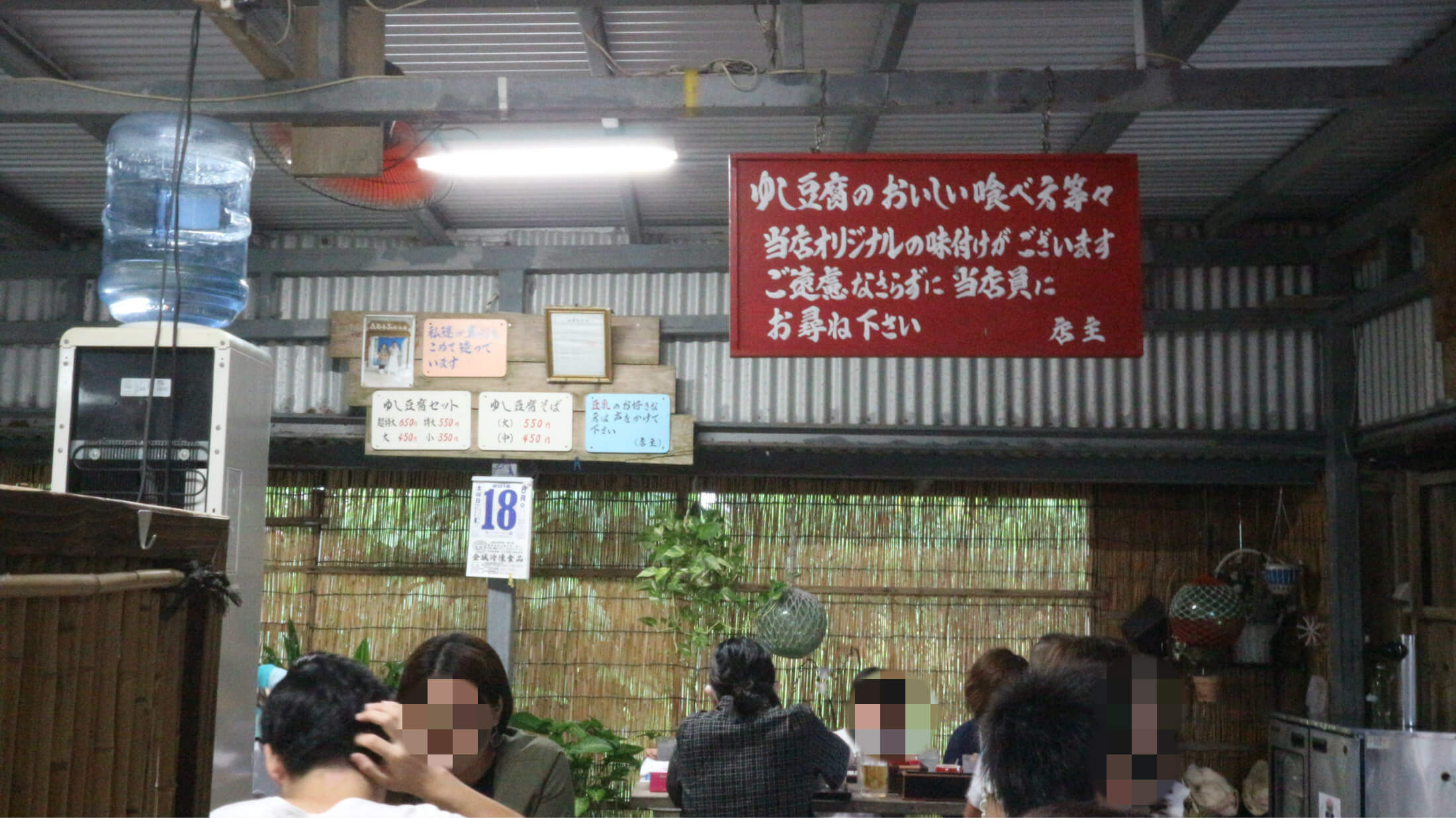 豆腐製造所に併設されたテラス席で頂きます。屋根はありますがオープンエアです。扇風機はありますが冷房はありません。そしてオープンエアがゆえにハエが多いです。僕が行った日は大雨だったためか少ないと思いましたが、それでも虫嫌いの3歳の次女はとても嫌がっていましたので虫が苦手な方にはちょっぴりきついかもしれません…
