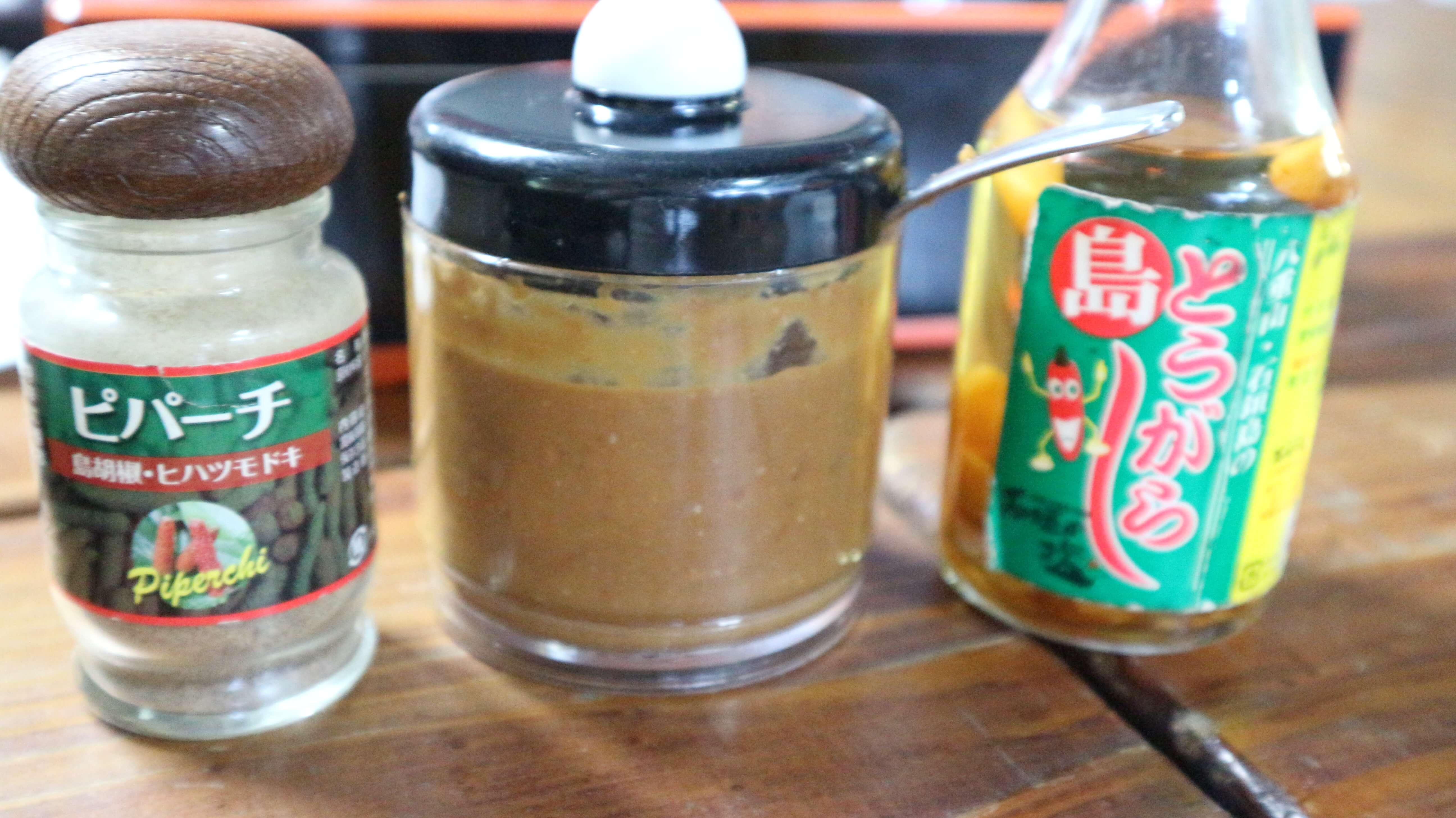 そしてテーブルには塩や醤油などおなじみの調味料だけでなく、石垣島らしいピパーチ(島こしょうと呼ばれる調味料)やコーレーグースー(島とうがらしを泡盛に漬け込んだ調味料)といった調味料もあります。そして一番おすすめなのは上の写真真ん中にある自家製味噌!豆腐も十分美味しいのですが途中で調味料で味を変えて食べるのがまた美味しいです。いろいろ入れてしまうと味が混ざってしまうのでレンゲでゆし豆腐を掬って、その上に調味料をかけて食べるのがいいでしょう!