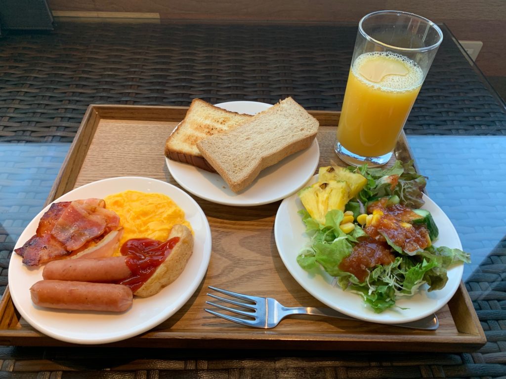 税抜き850円(税込み935円)でトースト、ベーコン、ウインナー、スクランブルエッグ、サラダ、フルーツなどが食べ放題!ちょっとお高めですが時間があってがっつり食べたい時はお勧めです!上層階窓側の席は飛行機の離発着が見られてゆったりできます。