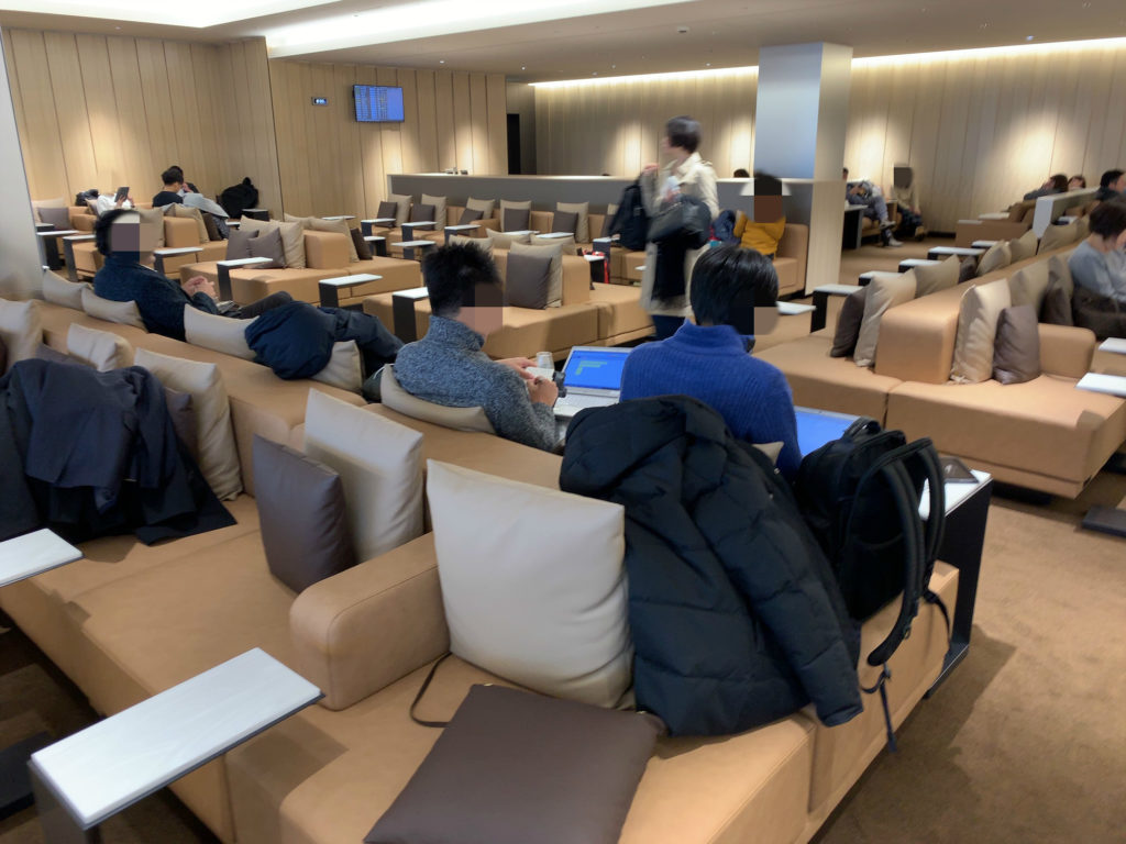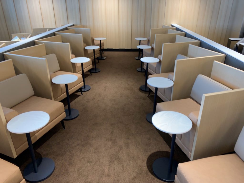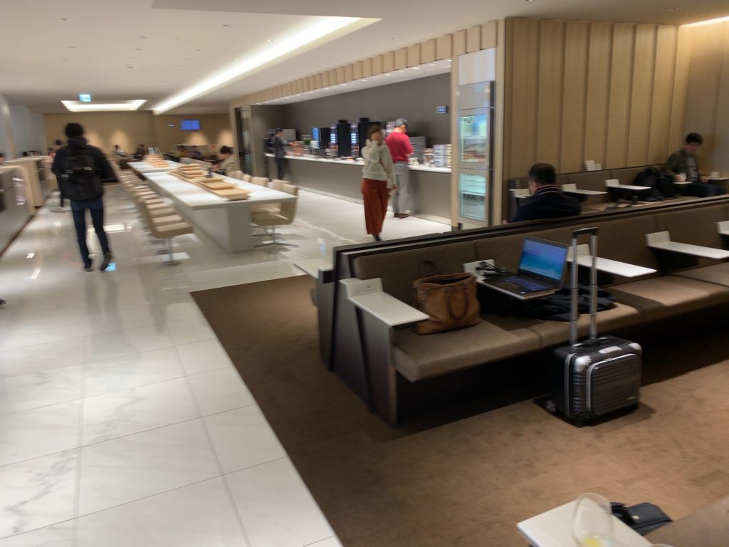 まずラウンジスペース入ってすぐ(見取り図「①」の場所)からラウンジを見た写真です。ぱっと見てお分かりのようにドリンクカウンターがあり、シートの種類もいろいろあります。