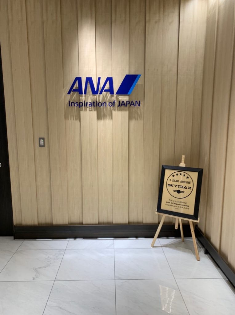 すると木の壁を背景としたANAのロゴが目に入ります!この木はANAラウンジの内装にも使われており、無機質でなく明るく温かみのある空間を演出しています。