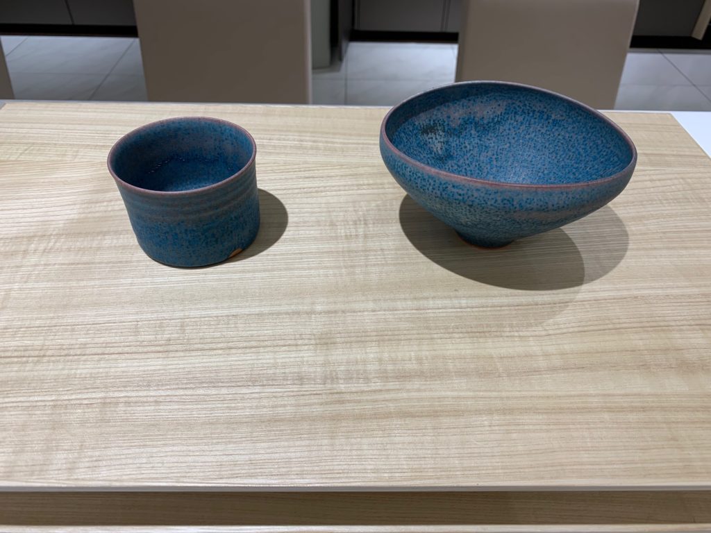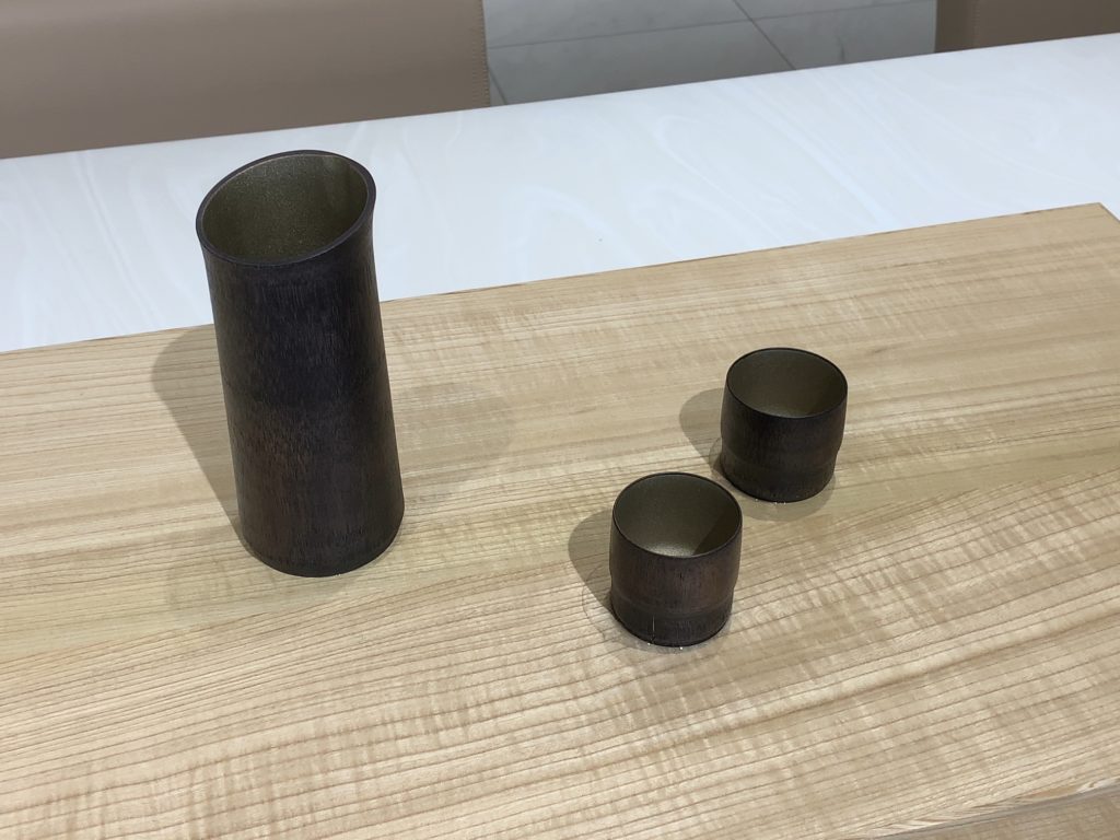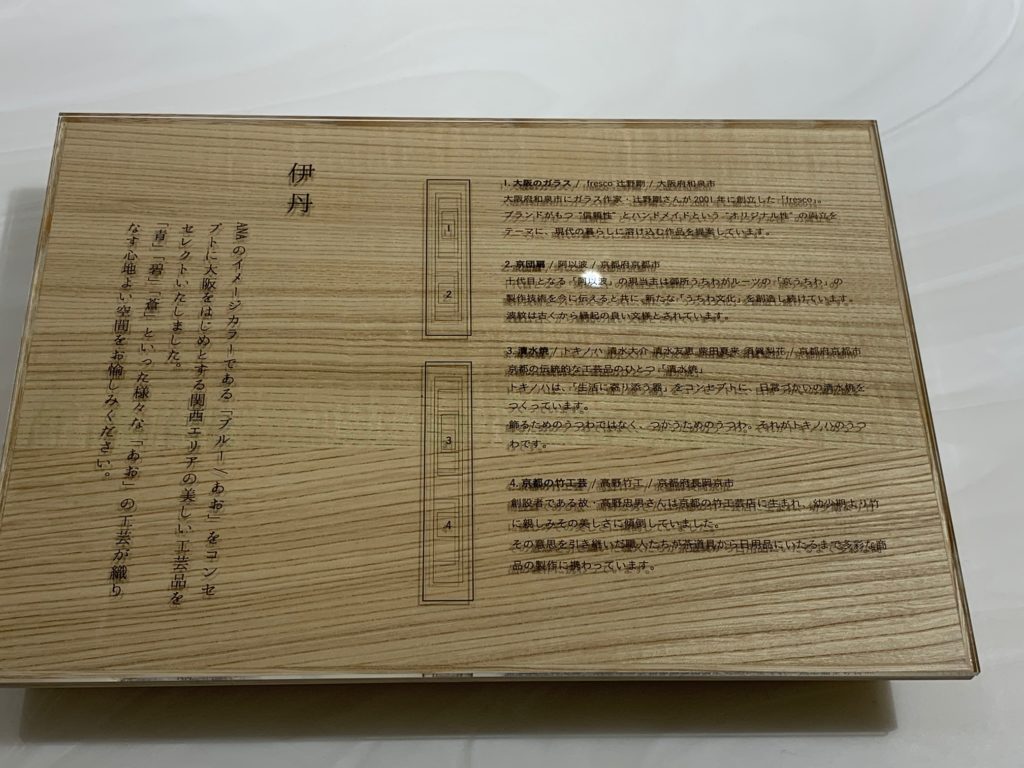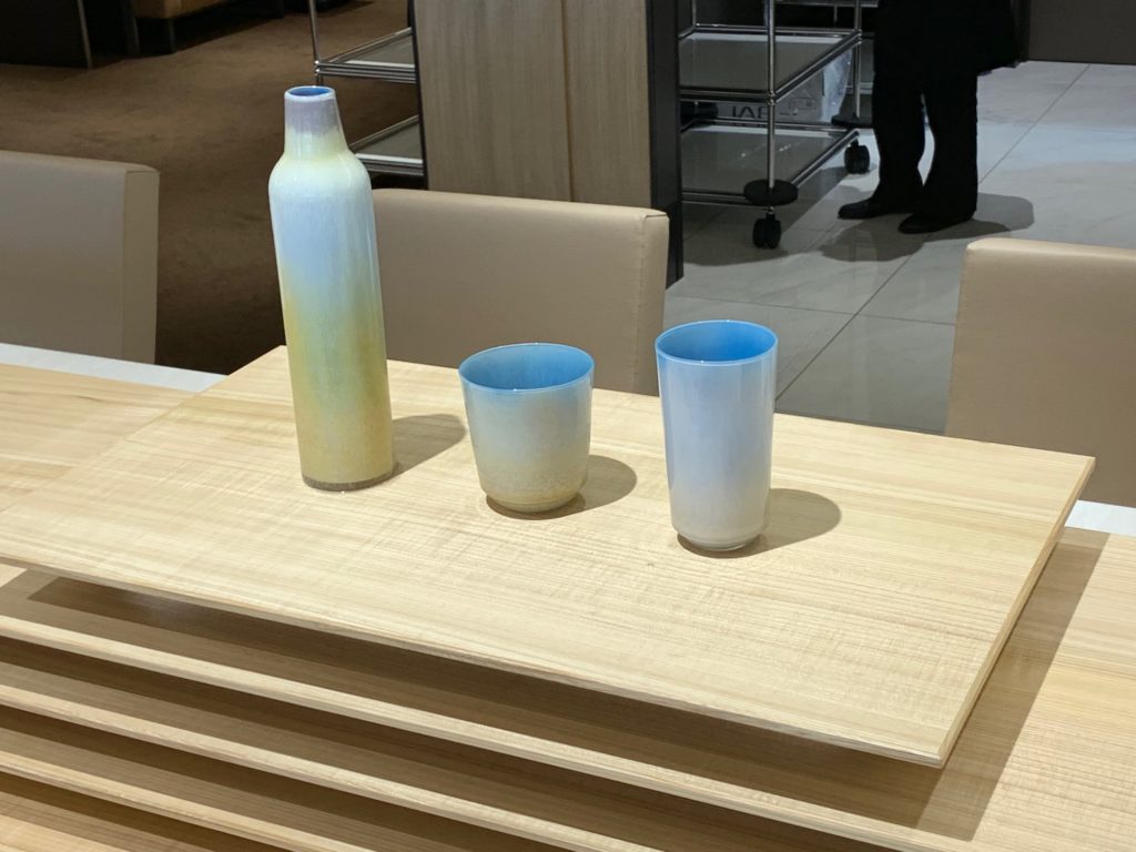 ANAのイメージカラーの青に合わせた地域性が感じられる工芸品がテーブルに並べられています。