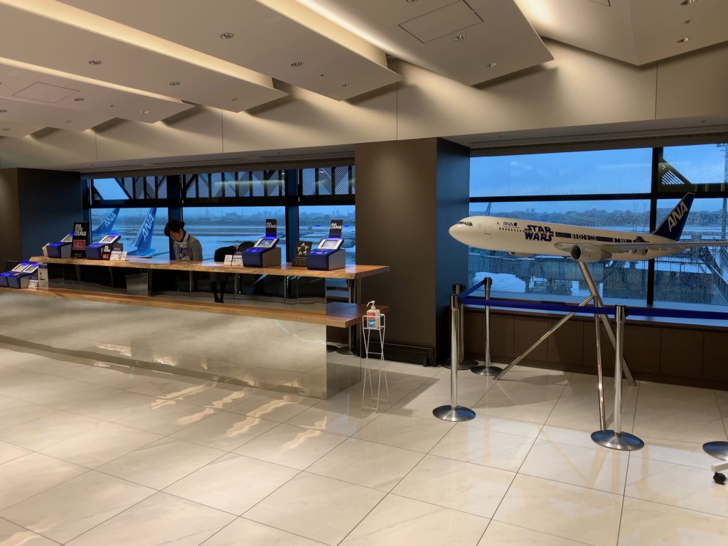 右手側がANAラウンジの受付、左手側がANAスイートラウンジの受付となっています。波打ったように見える天井は飛行機のフラップをイメージしているそうです。カウンターの後ろは窓となっていて、他の空港のラウンジとは違った雰囲気です。