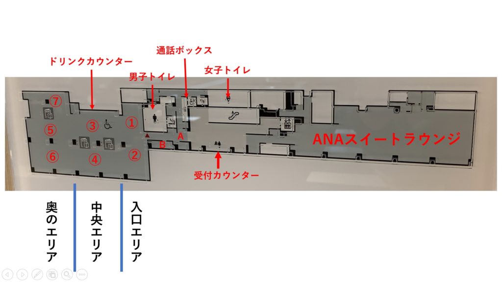 伊丹空港リニューアル後のANAラウンジ(ANA LOUNGE)の内部は以下のような配置になっています