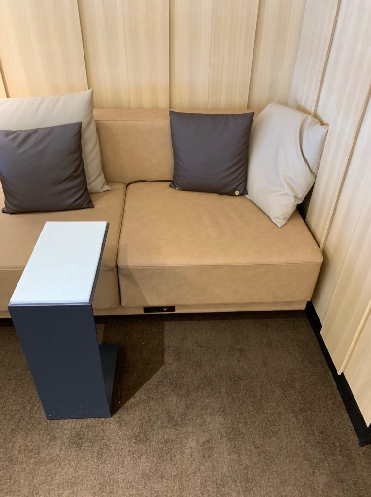 このエリアのソファは3種類あります。真ん中のエリア(見取り図「⑤」)は上の写真のように隣との仕切りがないクッション付きのソファーになっています。