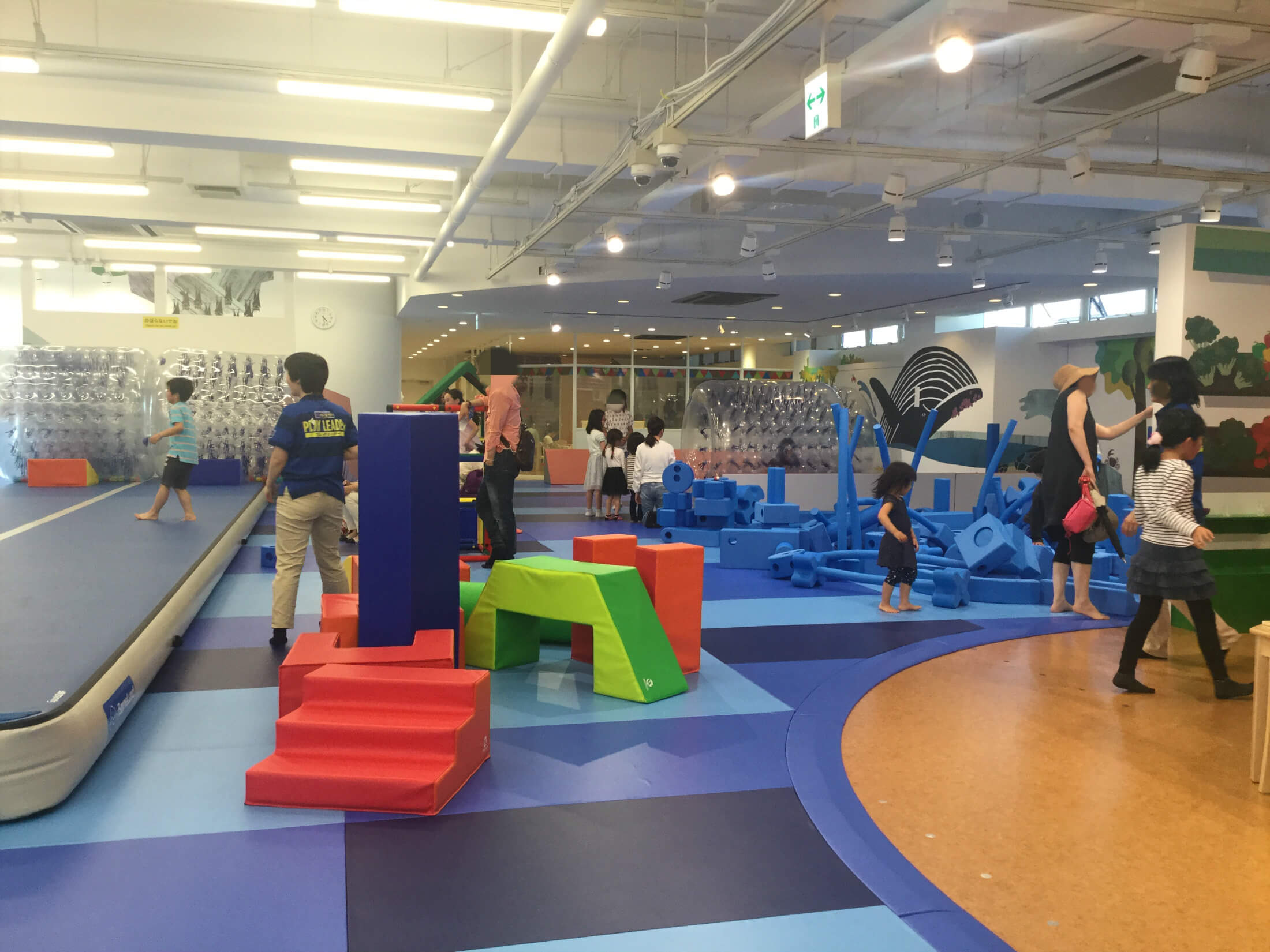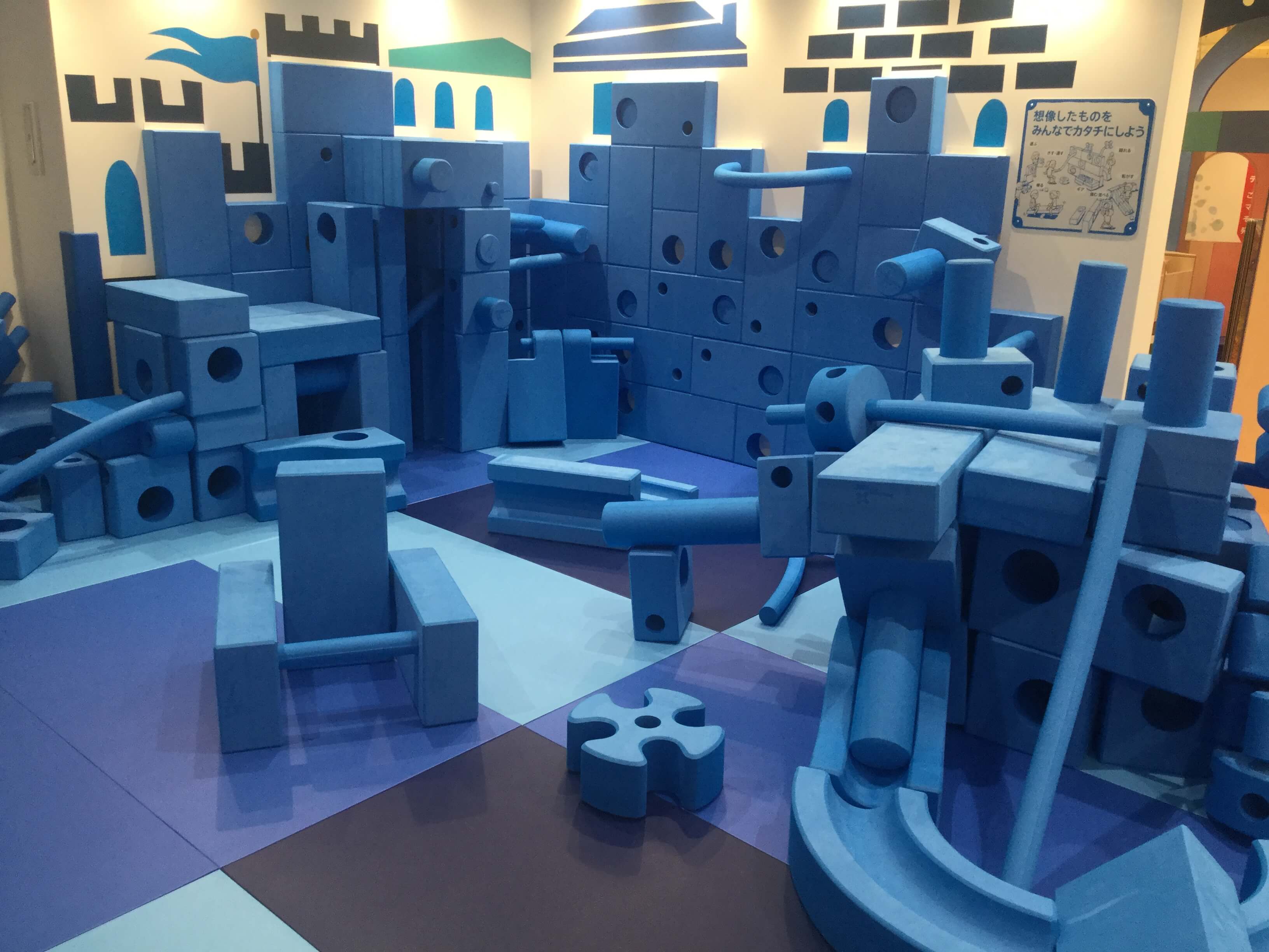 この大きな青いブロックは「イマジネーションプレイグラウンド」というそうです。他のキドキドでは数がこんなに多くなく、こんなにたくさんあるのを見たのは僕は初めてでした。高く積み上げたり、秘密基地を作ったり、ボールが転がるコースを作ったりいろいろ楽しめます。