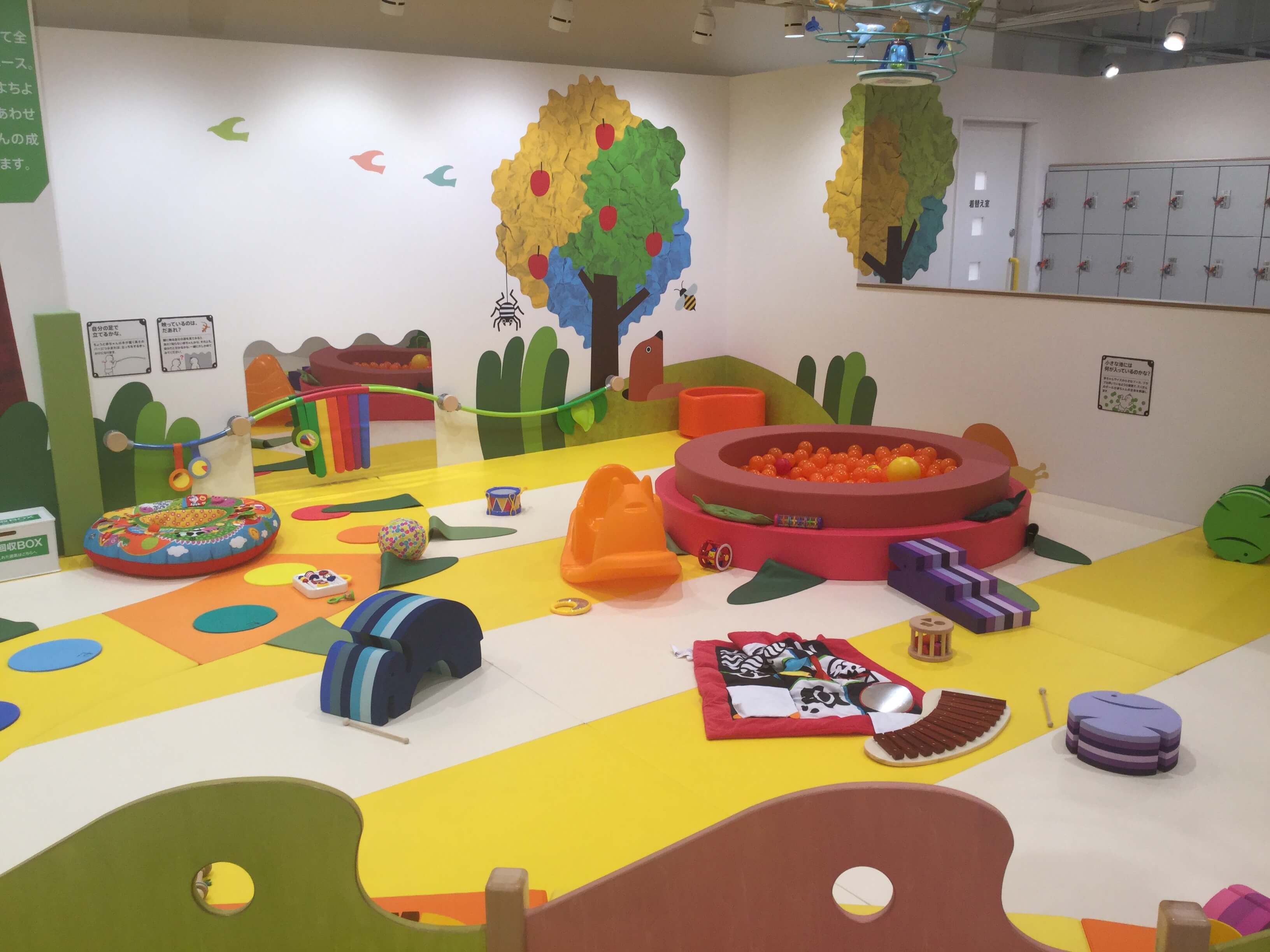 赤ちゃん専用の小さなボールプールがあったり、楽器・積み木・布のあそび道具・木のあそび道具などさまざまなあそび道具で赤ちゃんのペースでゆっくりと遊ぶことが可能です。