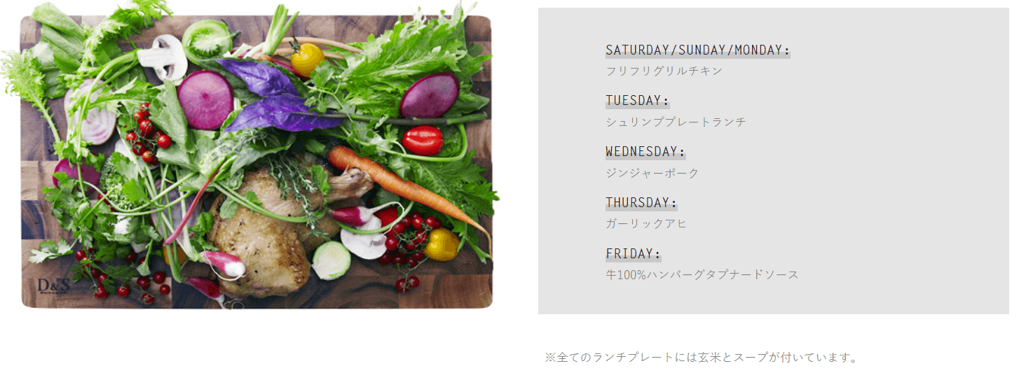 ランチタイム(11:30-14:00)はランチプレート1100円がおすすめです。月曜フリフリグリルチキン、火曜シュリンププレートランチ、水曜ジンジャーポーク…といったように日替わりでメインメニューが変わります。
