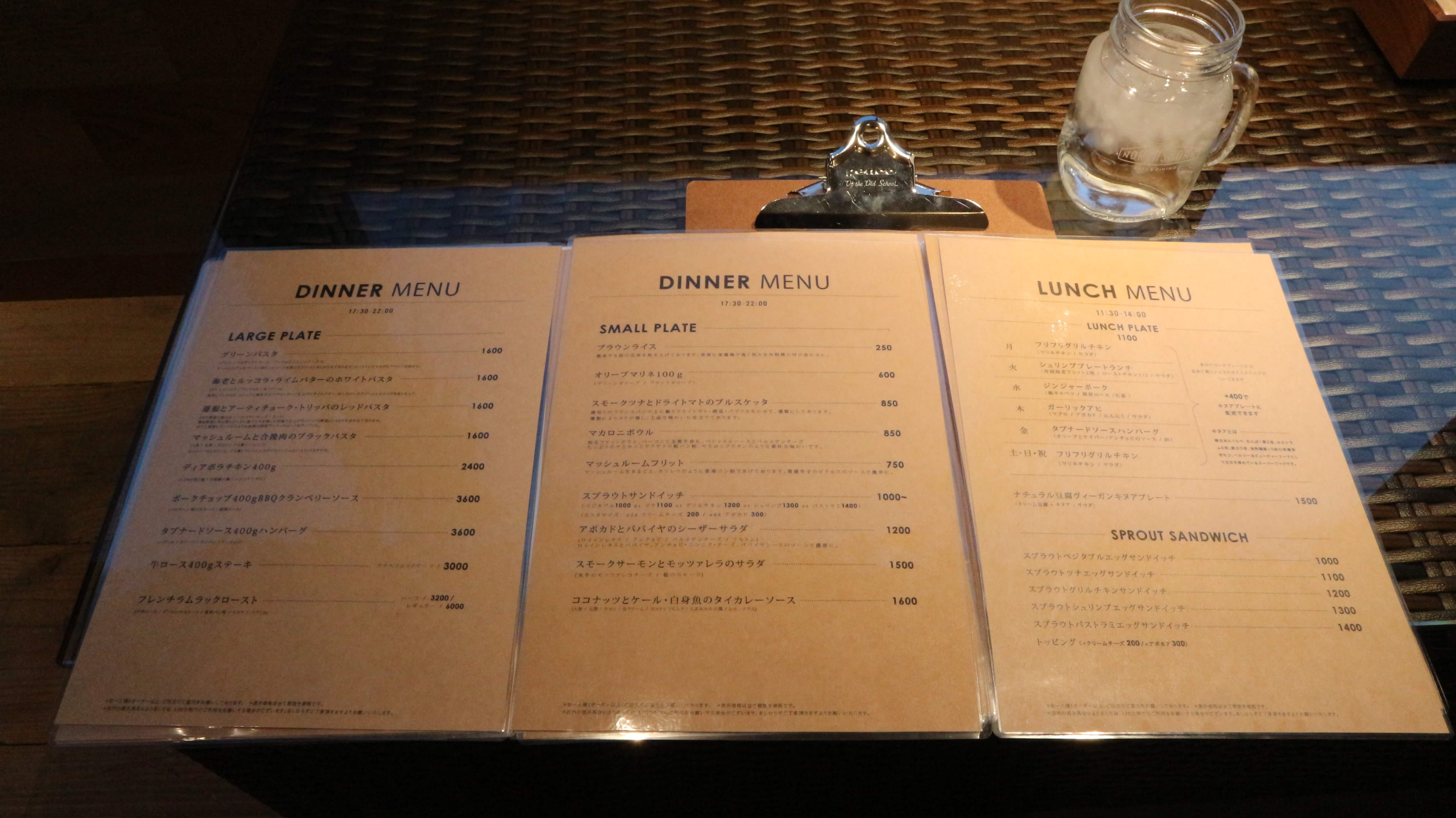 ディナータイムは(17:30-22:00)はがっつりいきたければ牛ロース400gステーキ3000円やディアボラチキン400g2400円あたりでしょうか。軽めであればグリーンパスタ1600円、スプラウトサンドイッチ(ベジタブル)1000円あたりがいいかと思います。