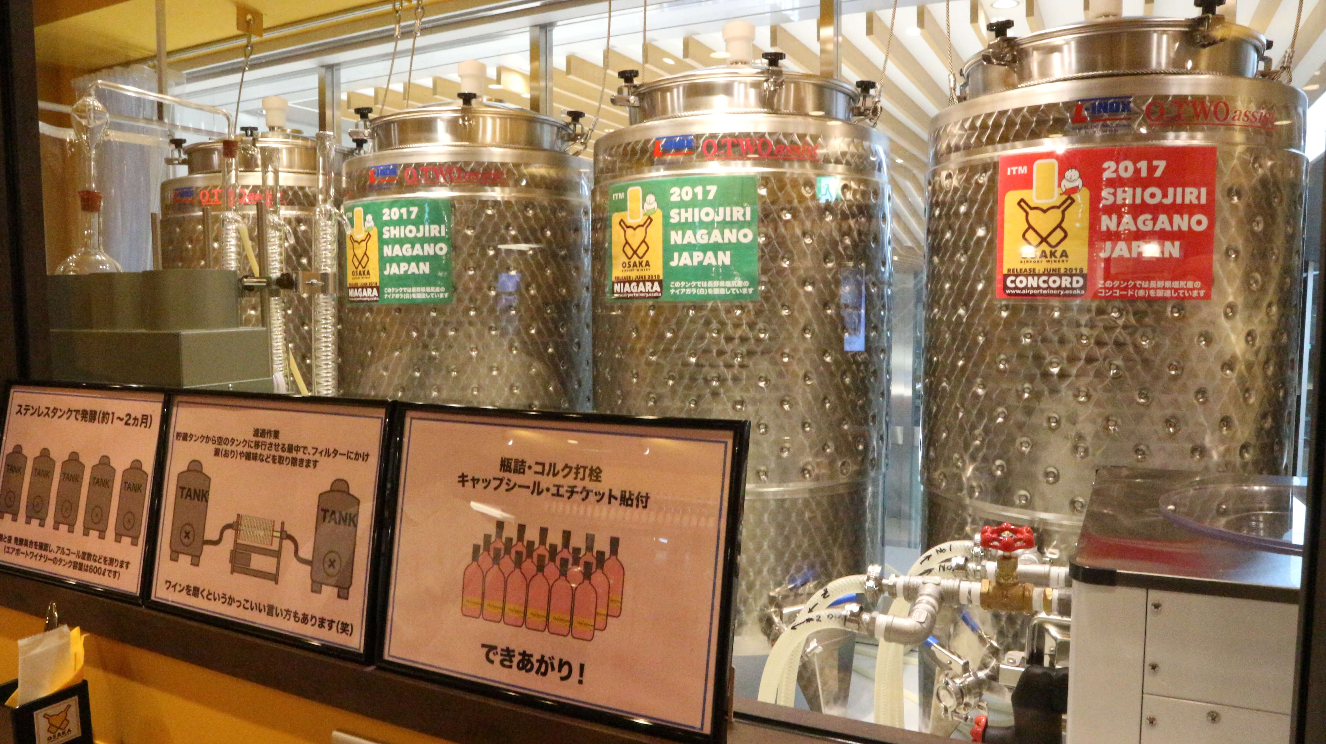 お店の奥側のガラス越しにはワインが醸造されているタンクが並んでいるのを見ることができます。