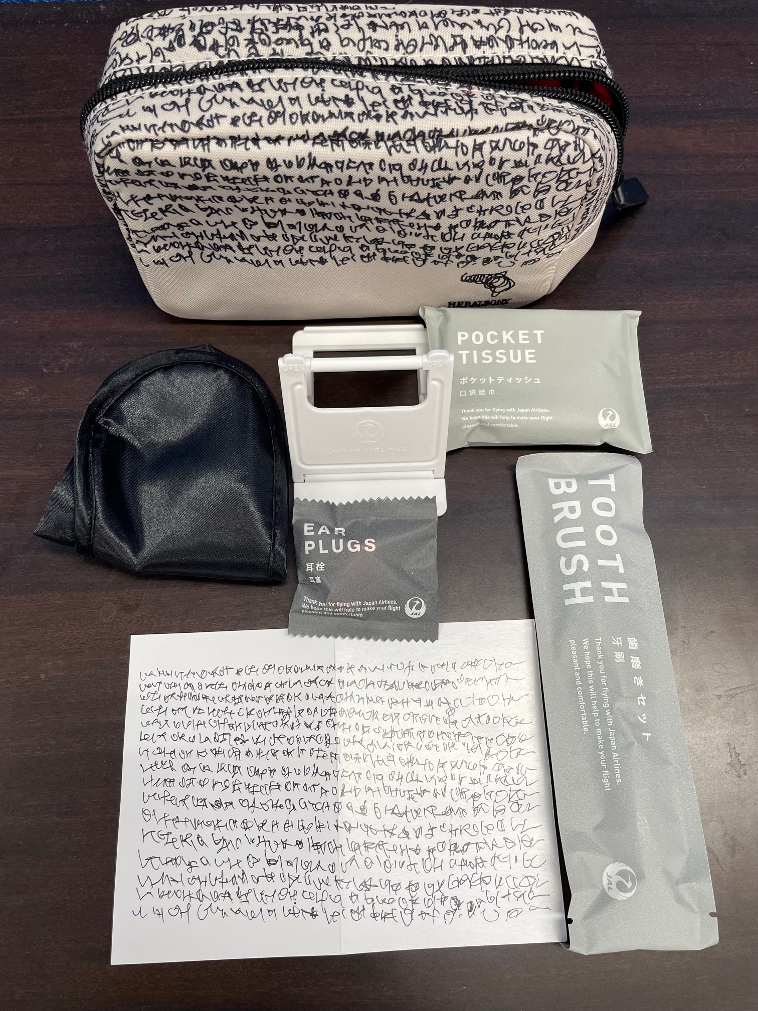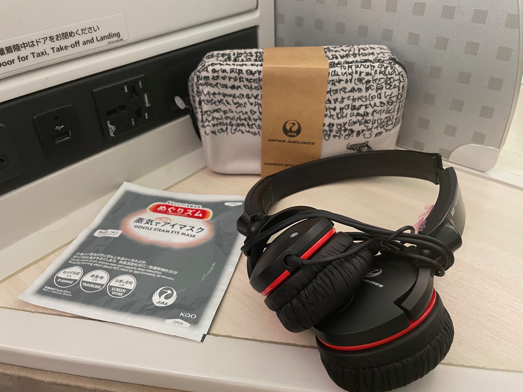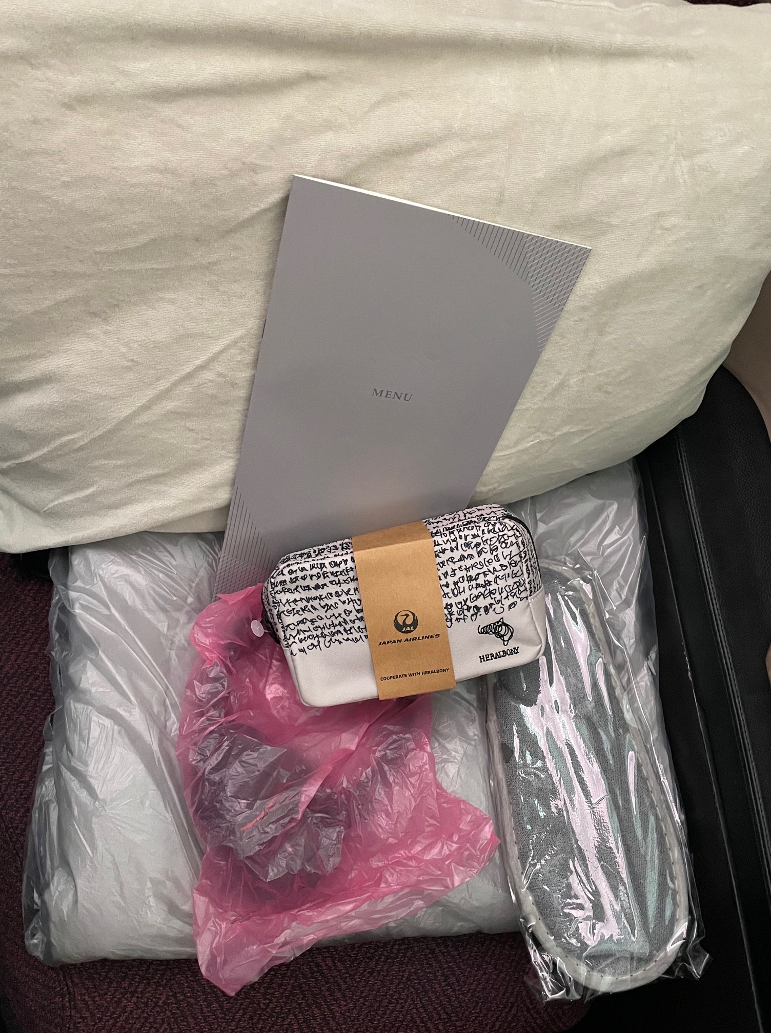 「HERALBONY(ヘラルボニー)」とコラボレーションしたアメニティーの入ったポーチ、スリッパ、ノイズキャンセリング機能付きソニー製の密閉型ヘッドホン、枕、ブランケットが座席に置かれていました