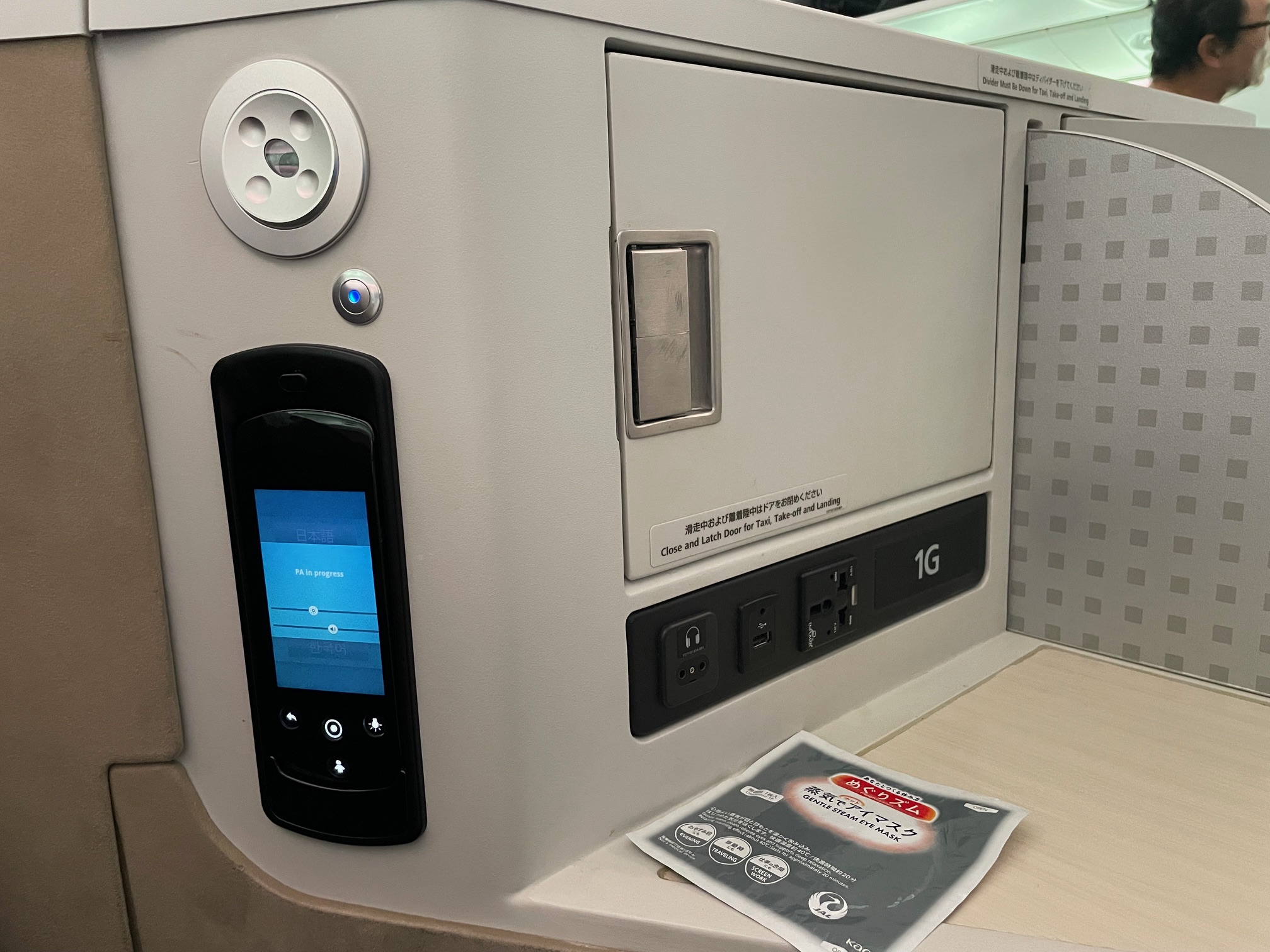 隣の席との間には可動式ディバイダー(パーテーション)があり、電源コンセントと充電用USB端子、イヤホンジャックがあります。コンセント類の上には小物入れが、座席側には読書灯とエンターテインメントコントローラーがあります。