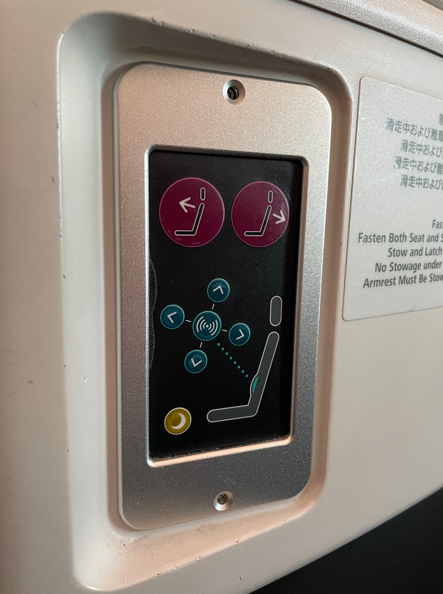 ちなみに通路側に内側に小物入れのある可動式アームレストが設けられています。押し下げると座面と同じ高さとなりベッド状態にした時に少し広く感じられます。