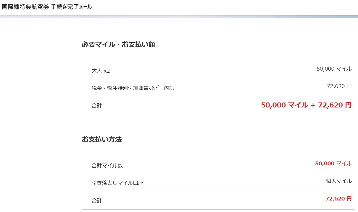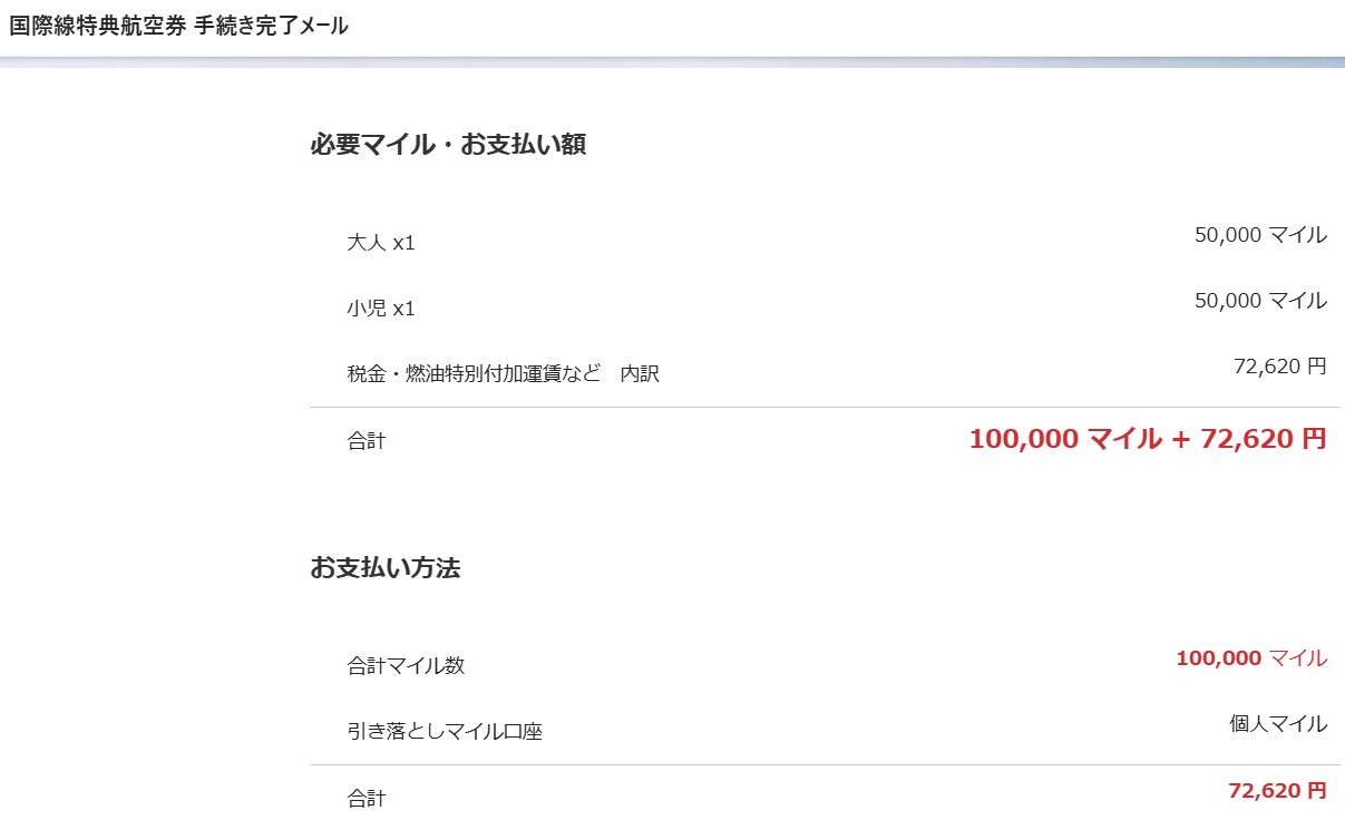 ビジネスクラス50000マイル×4名分、エコノミークラス25000マイル×4名分で合計300,000マイル、サーチャージなど諸費用が72620円×4名分=290,480円かかりました。