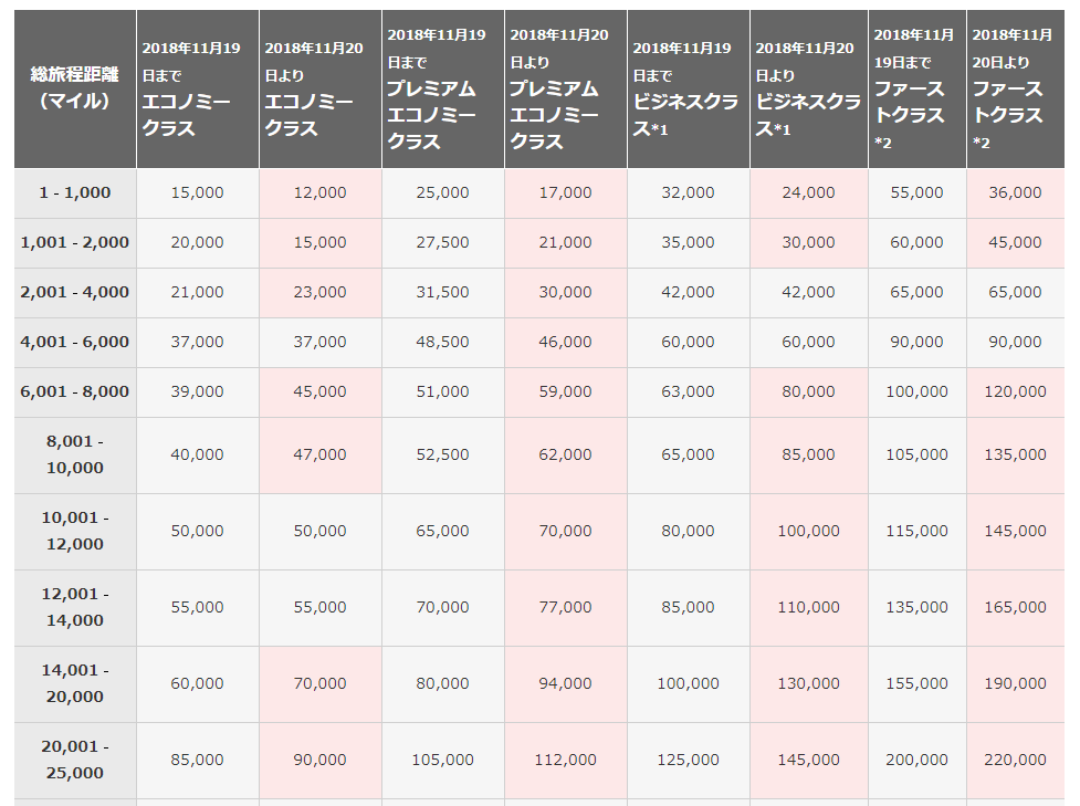 2018年11月20日 9:00(日本時間)より、JMB提携航空会社特典航空券交換時の必要マイル数がどのように変更になるかは以下のチャートをご参照ください。特に長距離でのビジネスクラス、ファーストクラスで必要マイルが増加していることが分かります。