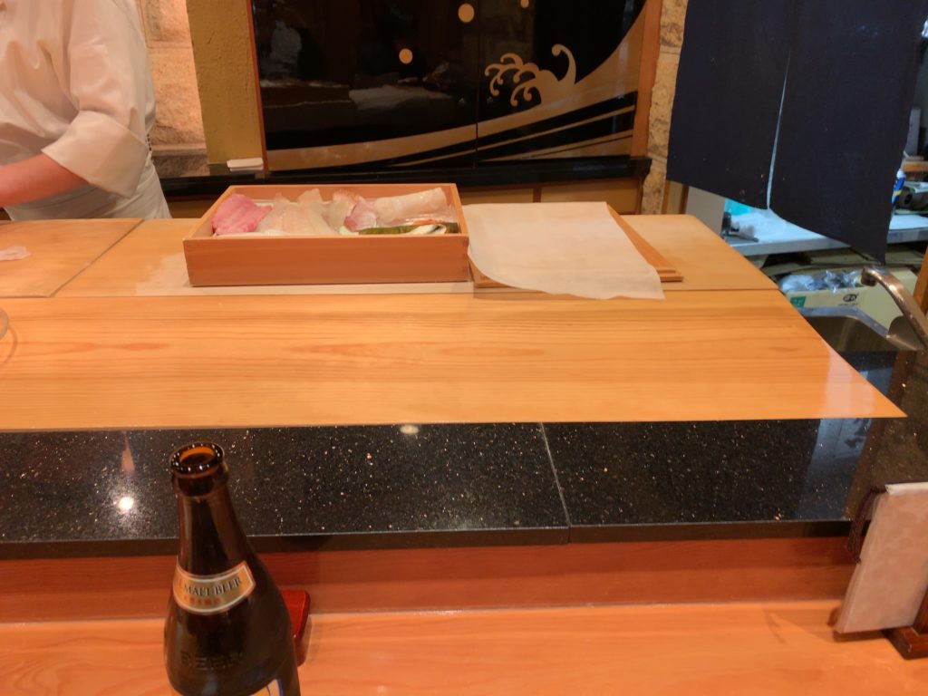 ネタはネタ箱から出され目の前で切り分けていかれます。大将は寡黙に手際よくどんどん握っていかれます。そのスピードはなかなかのものです。高級なお寿司屋さんは握る所作も美しいのですが、こちらはスピード重視という感じでしょうか(^^;)ディナーの時間帯で寿司をつまみながらゆっくり飲みたいと思っていた私にはそのスピードはかなり速く、まだ食べていないのに次々と寿司を出されるのでペースが乱れました。その結果、想定より早く1時間ちょっとでお店を出ることになりました…もう少しゆっくりと頂きたかったというのが正直なところです