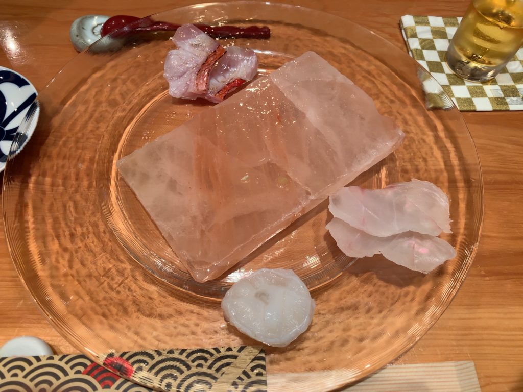 凍らせた岩塩にスダチを搾って擦り付けて食べるように説明されます。見た目にはインパクトがあるのですが岩塩に擦り付けるとしょっぱすぎて…ご覧のようにあっさりとしたものばかりなのでせっかくの素材の風味よりしょっぱさだけが残ってしまいます。少し触れるだけでほんのりと塩味がつくのでそれで十分です