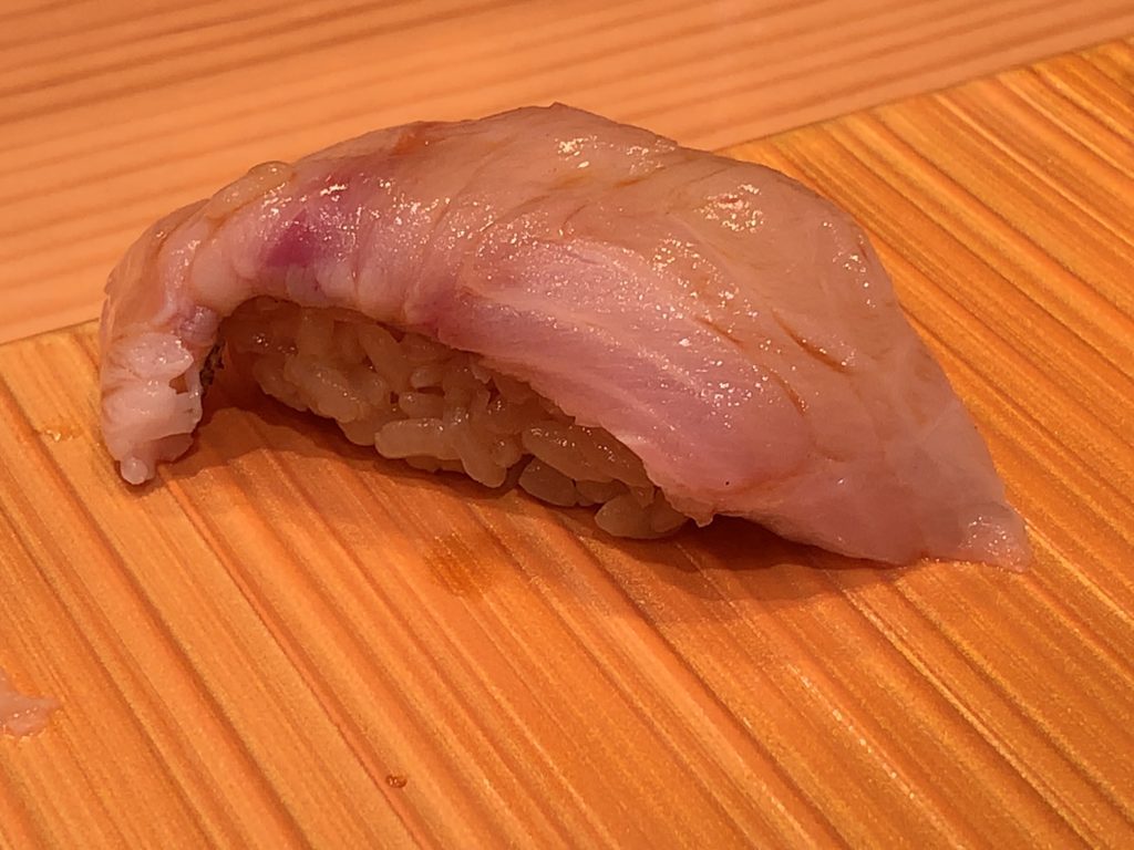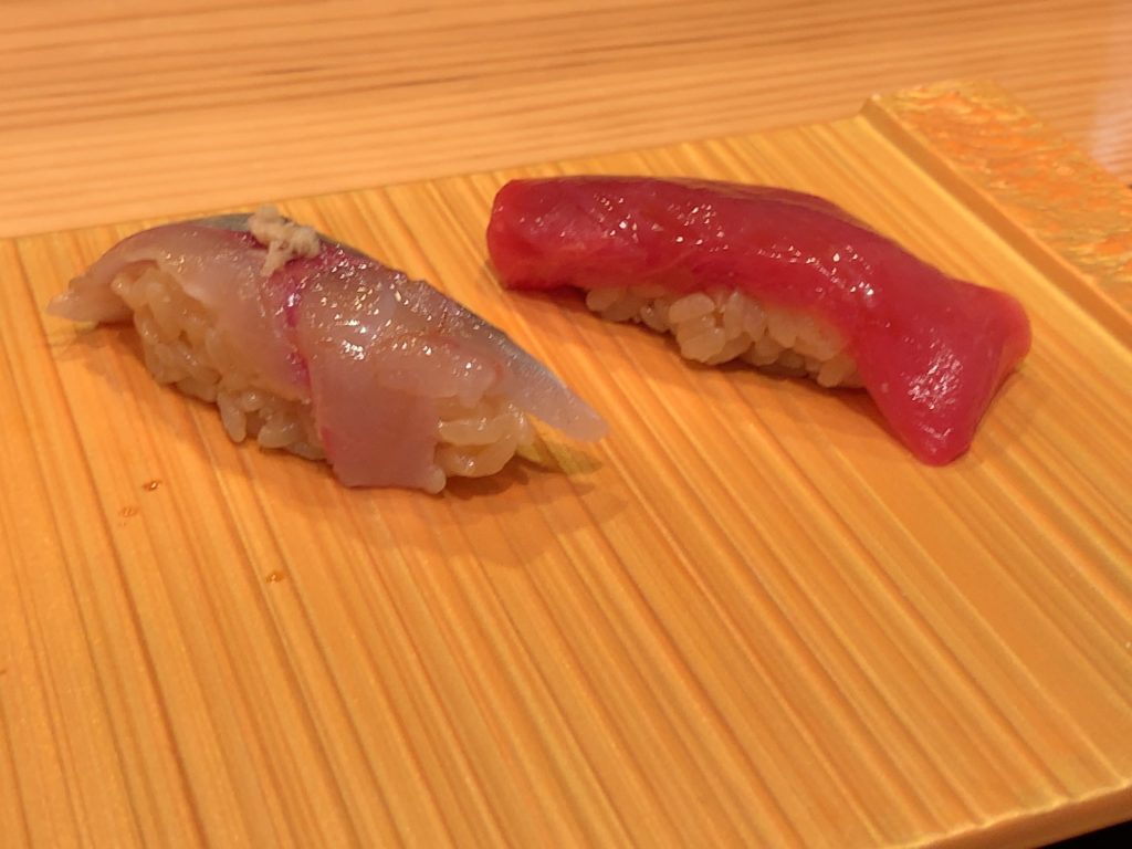 カワハギはシャリとネタの間に肝が挟まれています。メカジキは湯引きされています。もうちょっと漬けてもよさそうです。