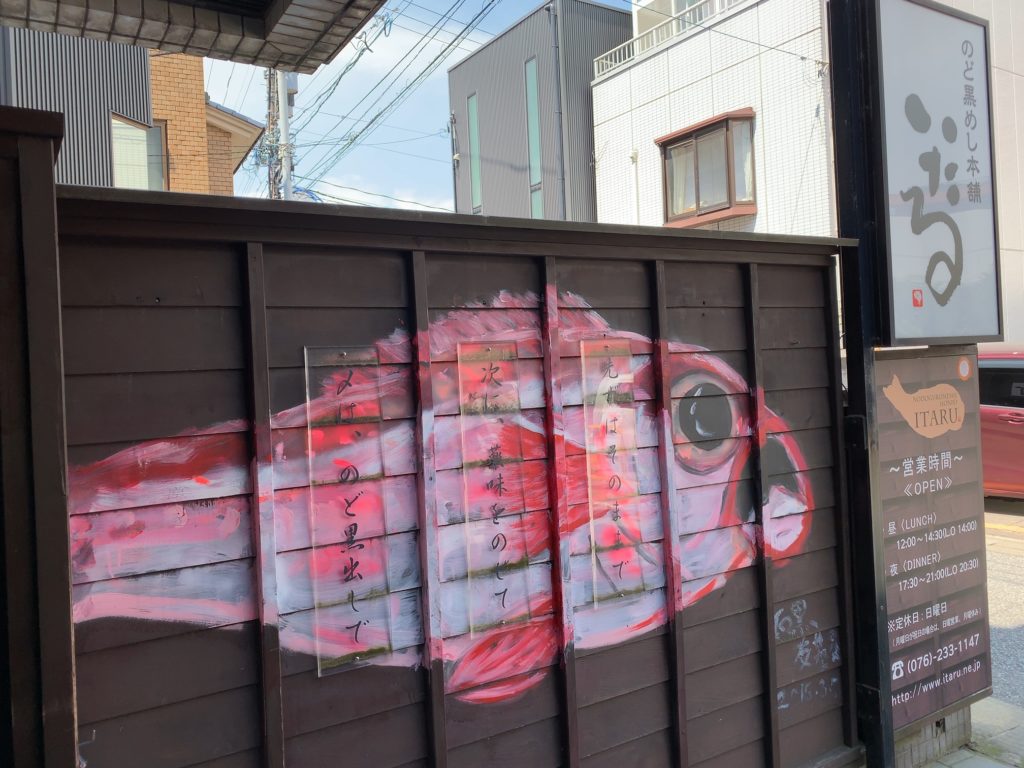 「のど黒めし本舗いたる」はのどぐろ料理に特化したお店になり、この店舗のみがランチも営業しています。金沢21世紀美術館から徒歩3分程の場所にあります。金沢市役所の裏手の道を進み、少し入ったところに見える大きなのどぐろの絵が目印です。