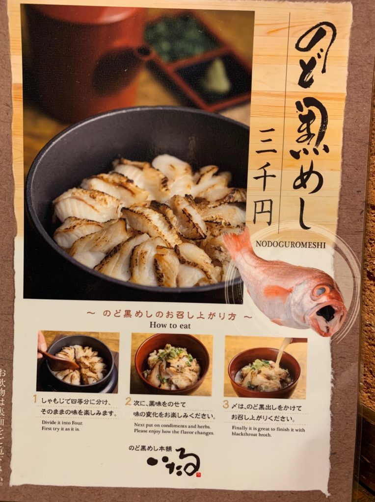 来店した方のほとんどが注文する看板メニュー「のど黒めし」は3000円。ひつまぶしのように食べ方を変えて楽しむスタイルです。