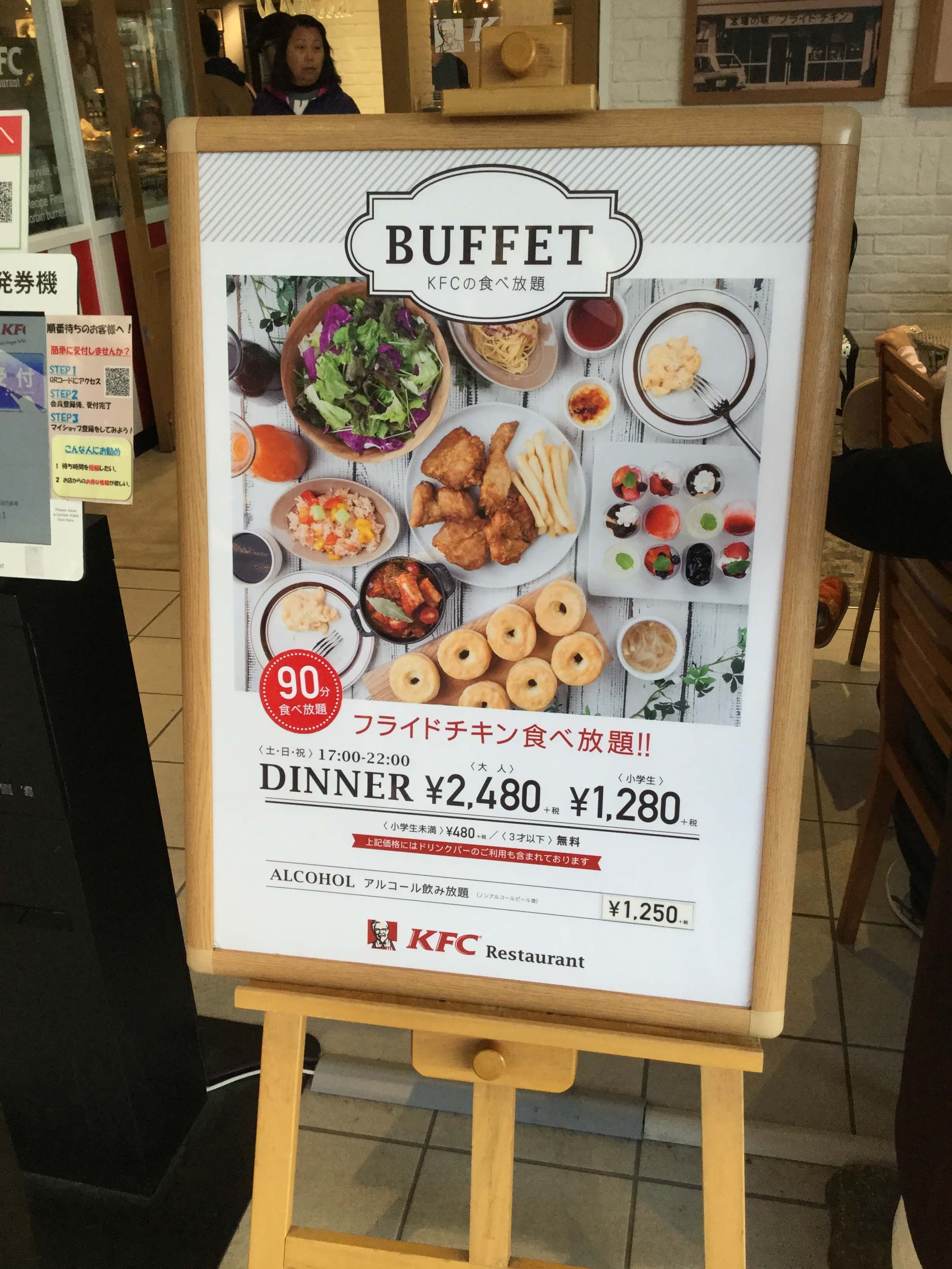 お店の外にはケンタッキーフライドチキンの他の店舗同様カーネルサンダースが立っており食べ放題の表示が出ています。