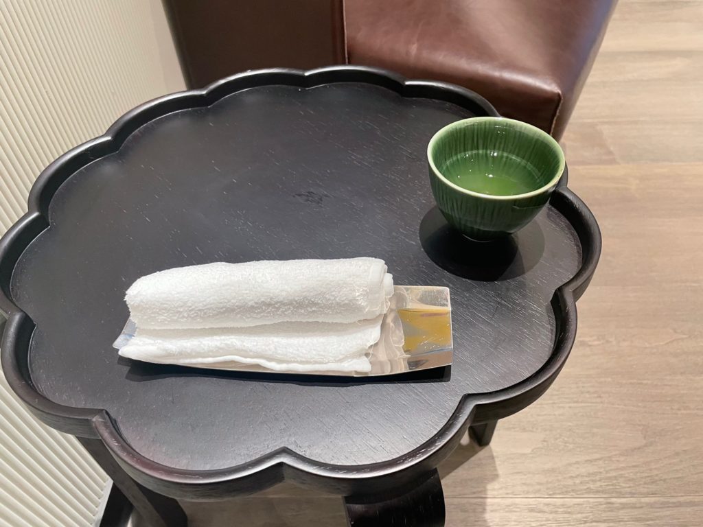 ウェルカムドリンクの緑茶にレモングラスの香りづけのスプレーをしゅっしゅっとかけてくれます。